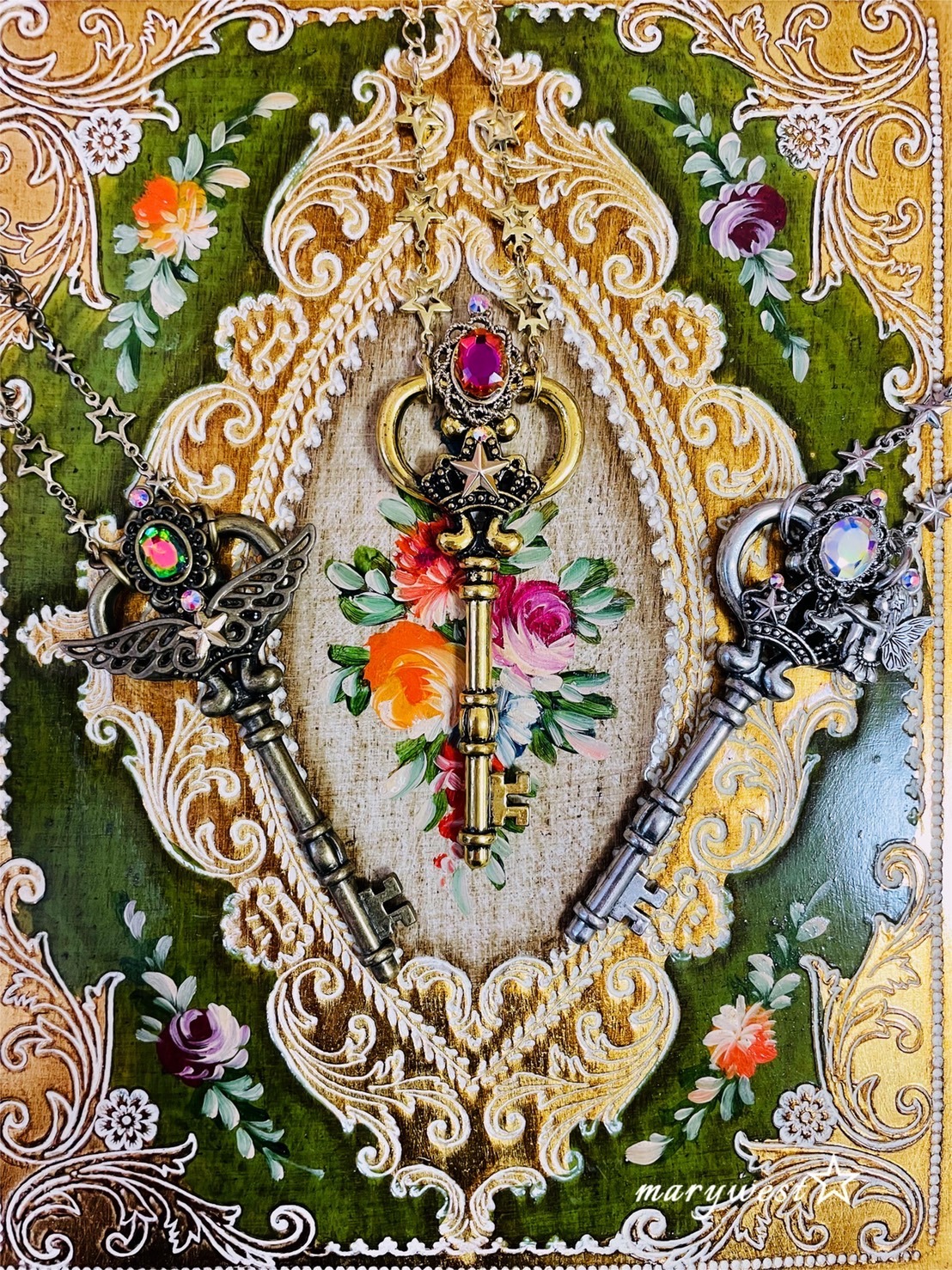 精霊のお守りの鍵ペンダント (3種)長さ約55cm +5cm 風の精霊 火の精霊 光の精霊
