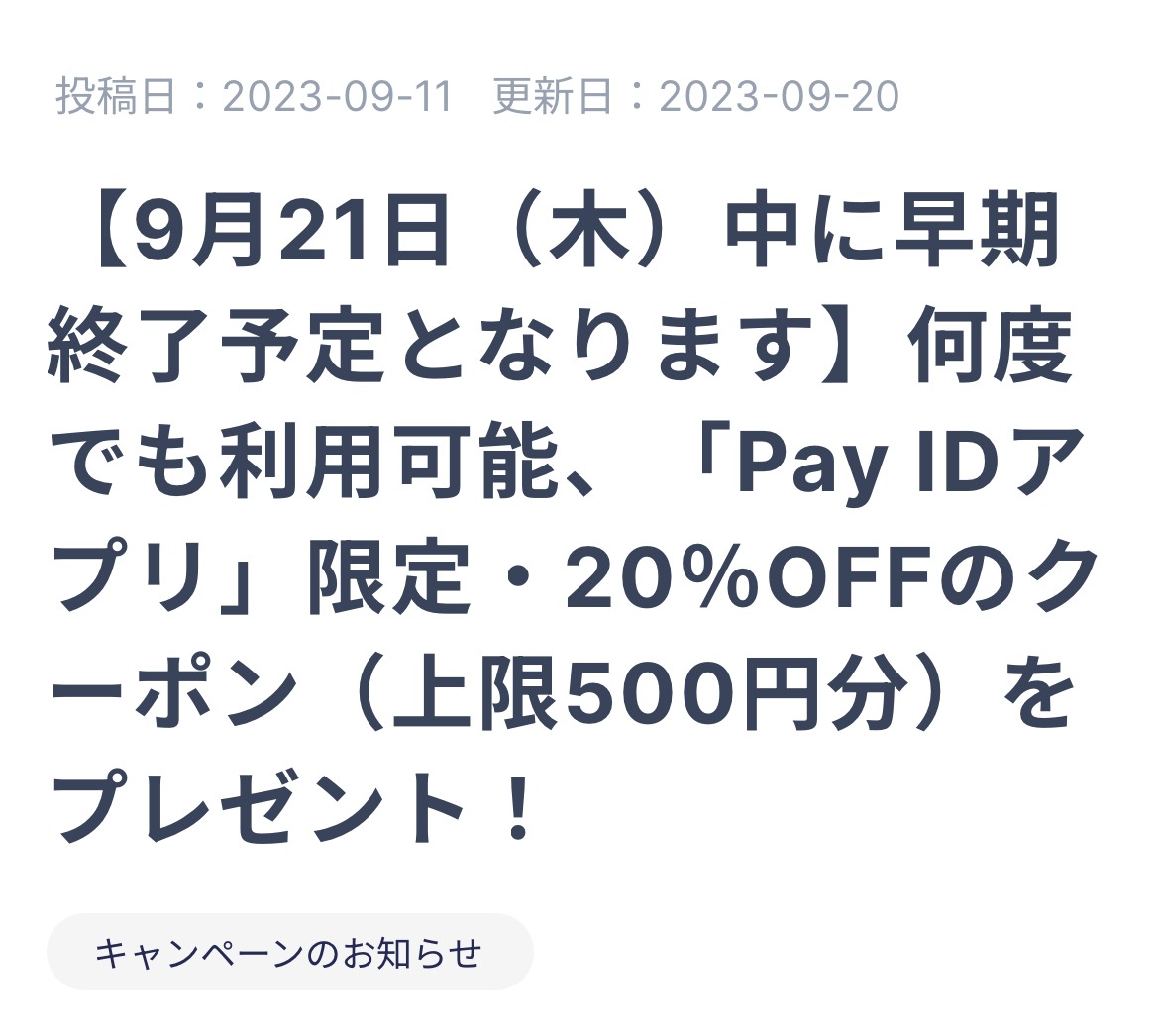 「Pay IDアプリ」限定で20%OFFクーポン(上限500円)が発行されました!