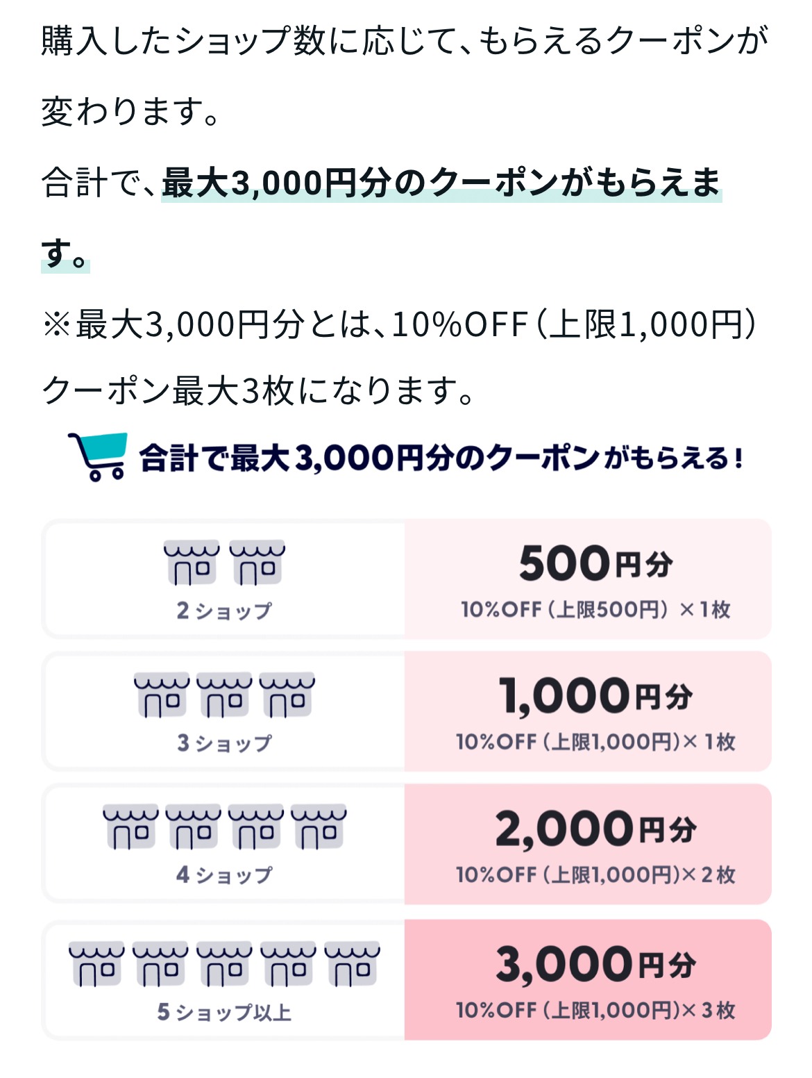 購入前にエントリーが必要で購入したショップ数に応じてもらえるクーポンが変わるなんて