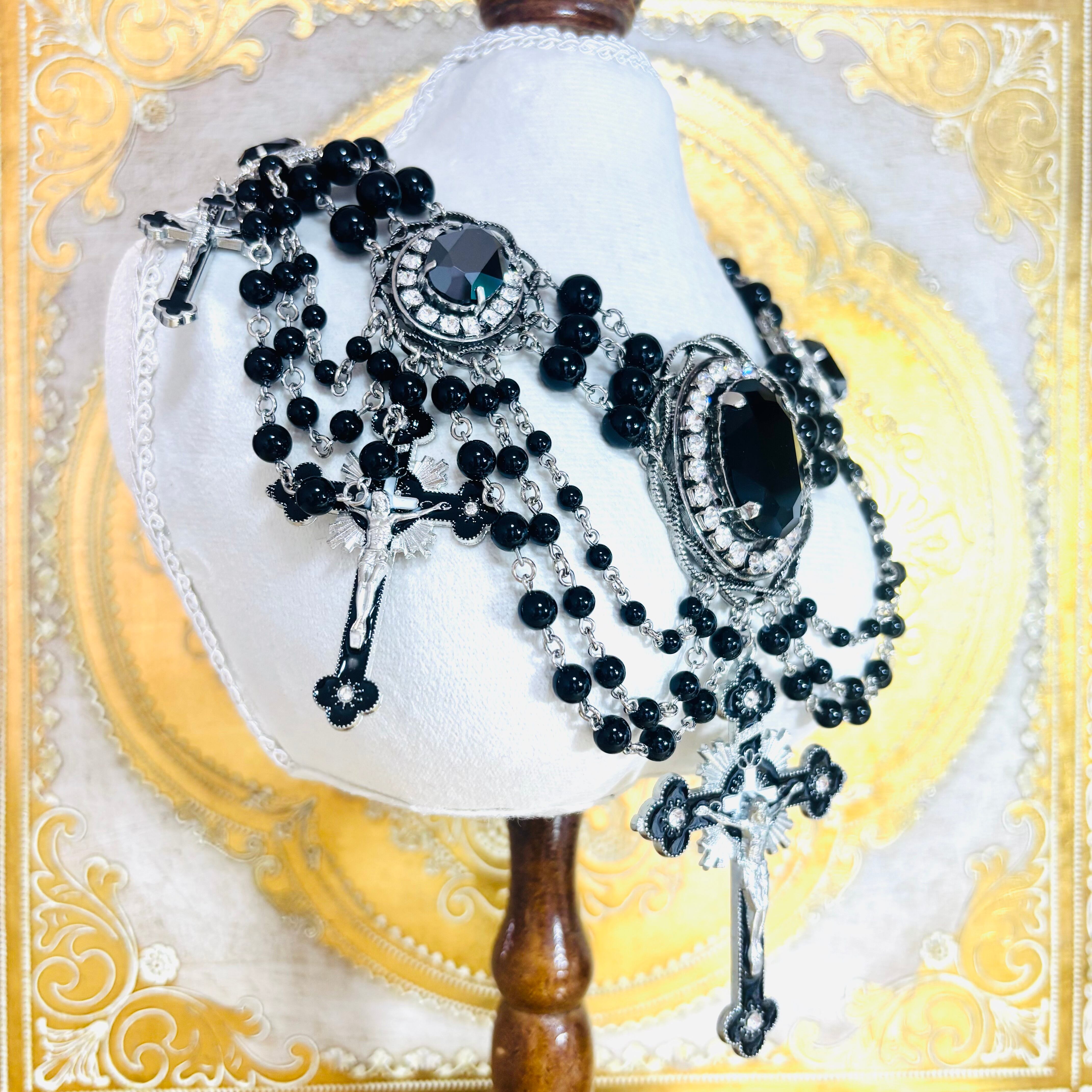 黒パールとブラック系クリスタルが重厚感のあるネックレスです。