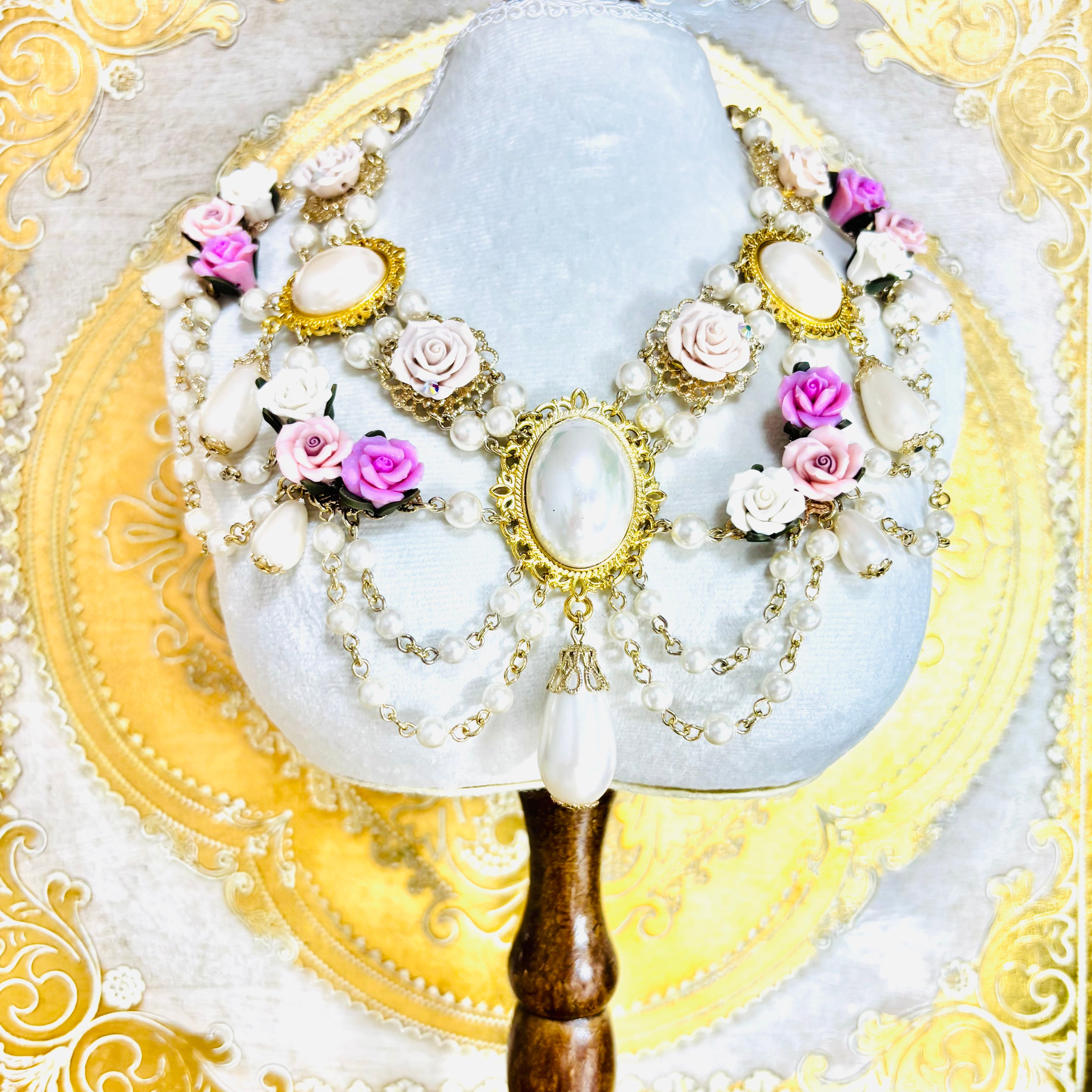 セラミックとクレイの薔薇パーツを使ったピンクのブーケのようなネックレスです