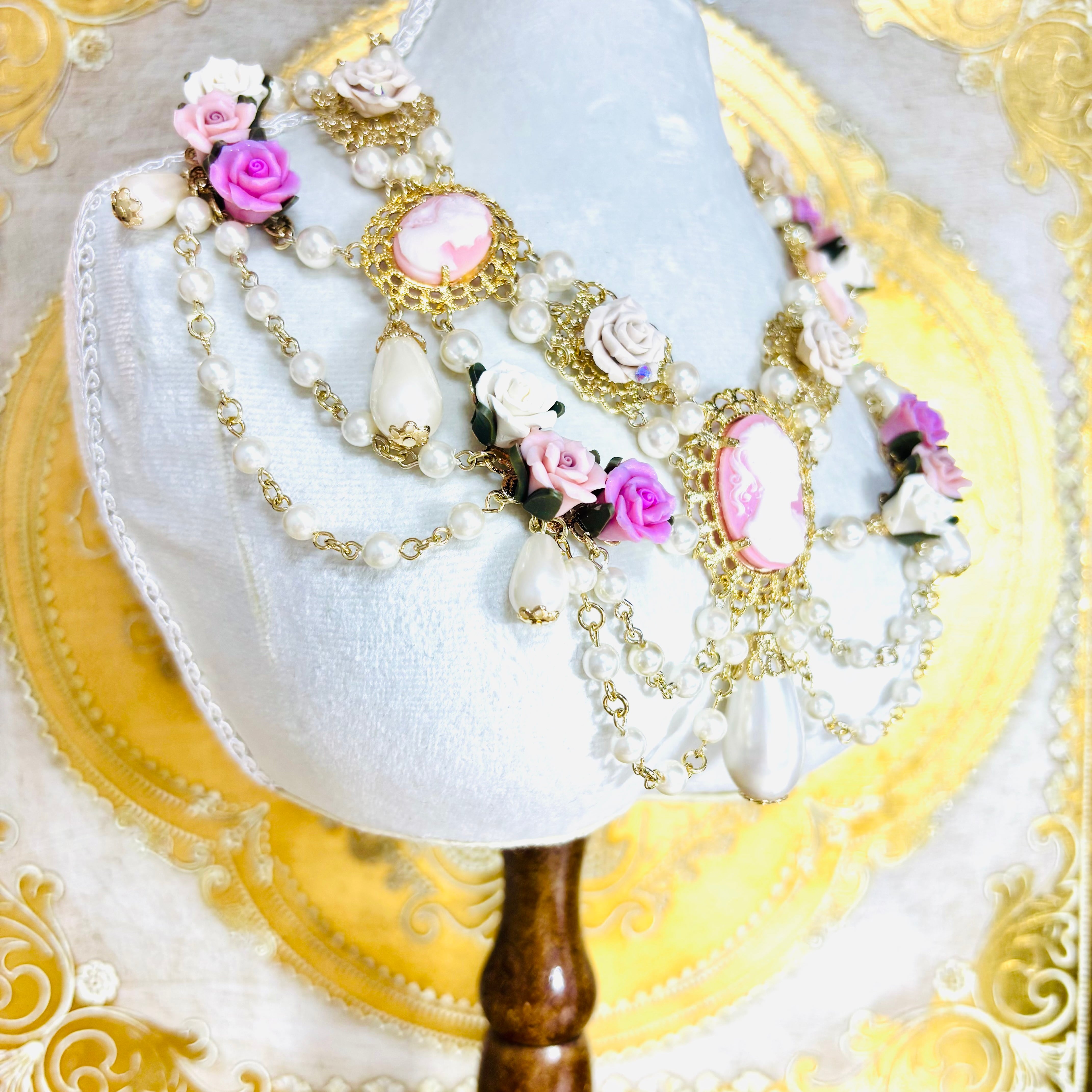 セラミックとクレイの薔薇パーツを使ったピンクのブーケのようなネックレスです