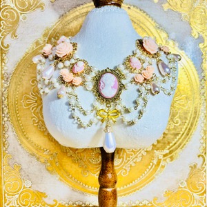 ピンクの薔薇パーツとエレガントな貴婦人の横顔のカメオを使用した華やかなネックレスです