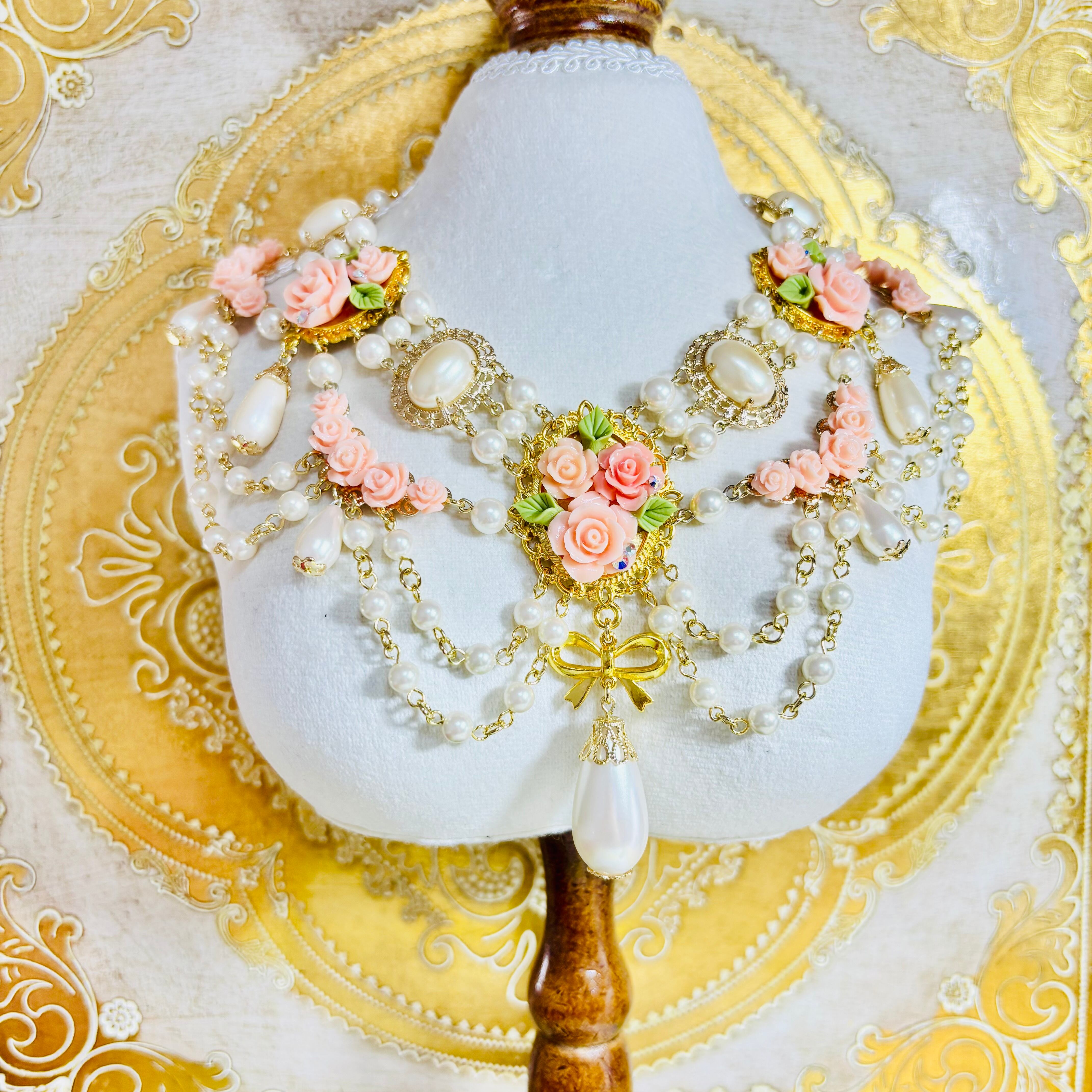 5種類の薔薇パーツと6種類のパールを組み合わせた華やかなネックレスです