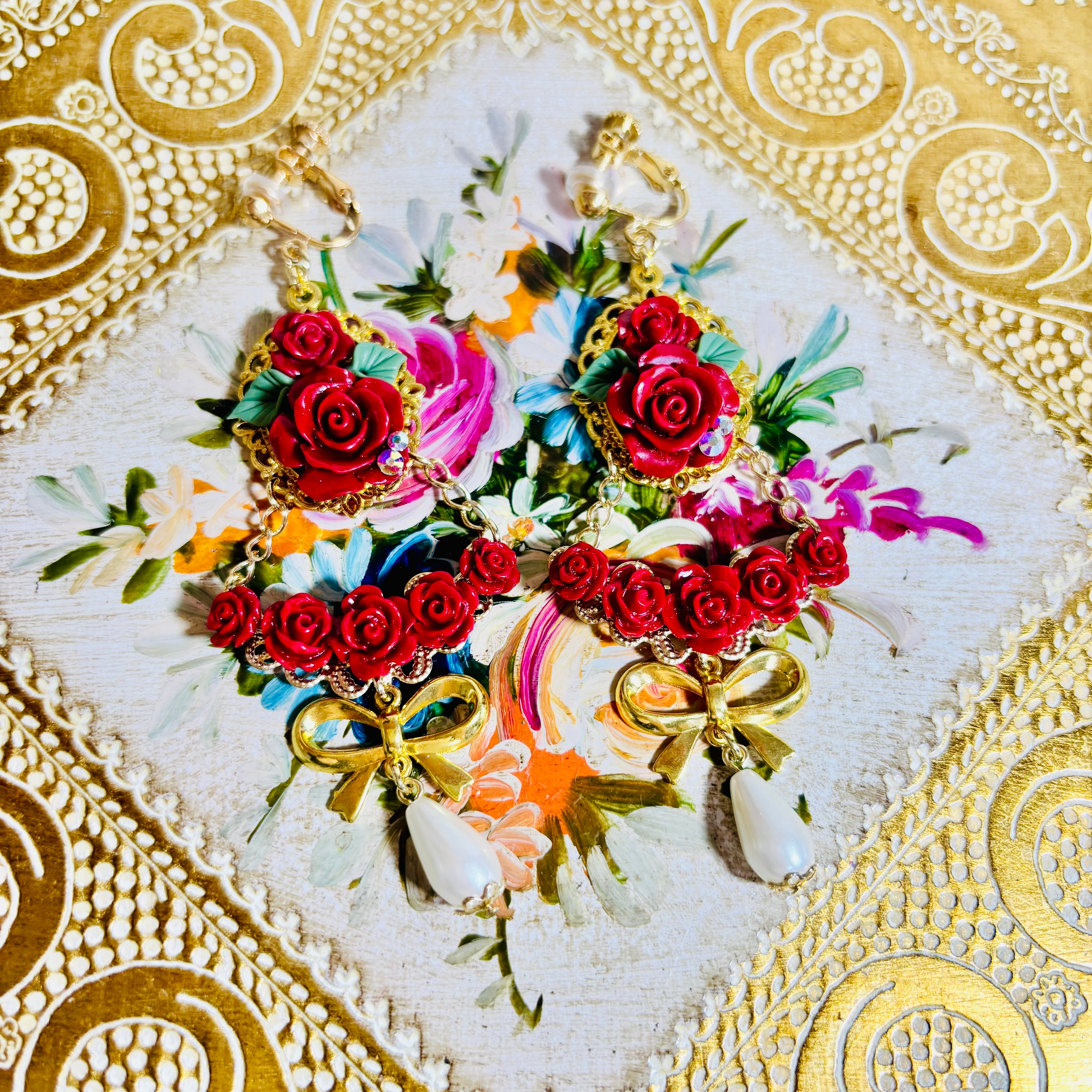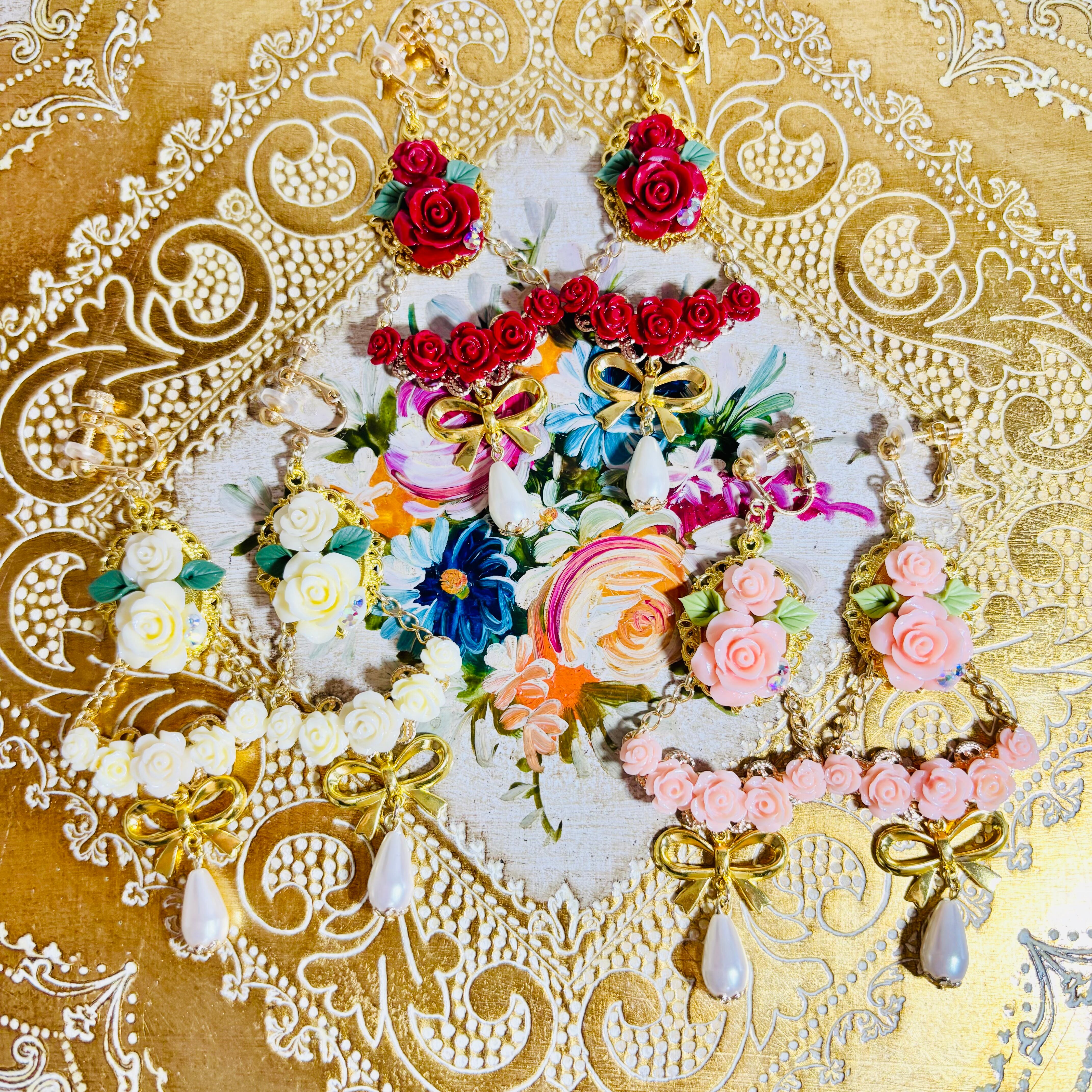 花束のように薔薇を束ねた華やかなイヤリングです