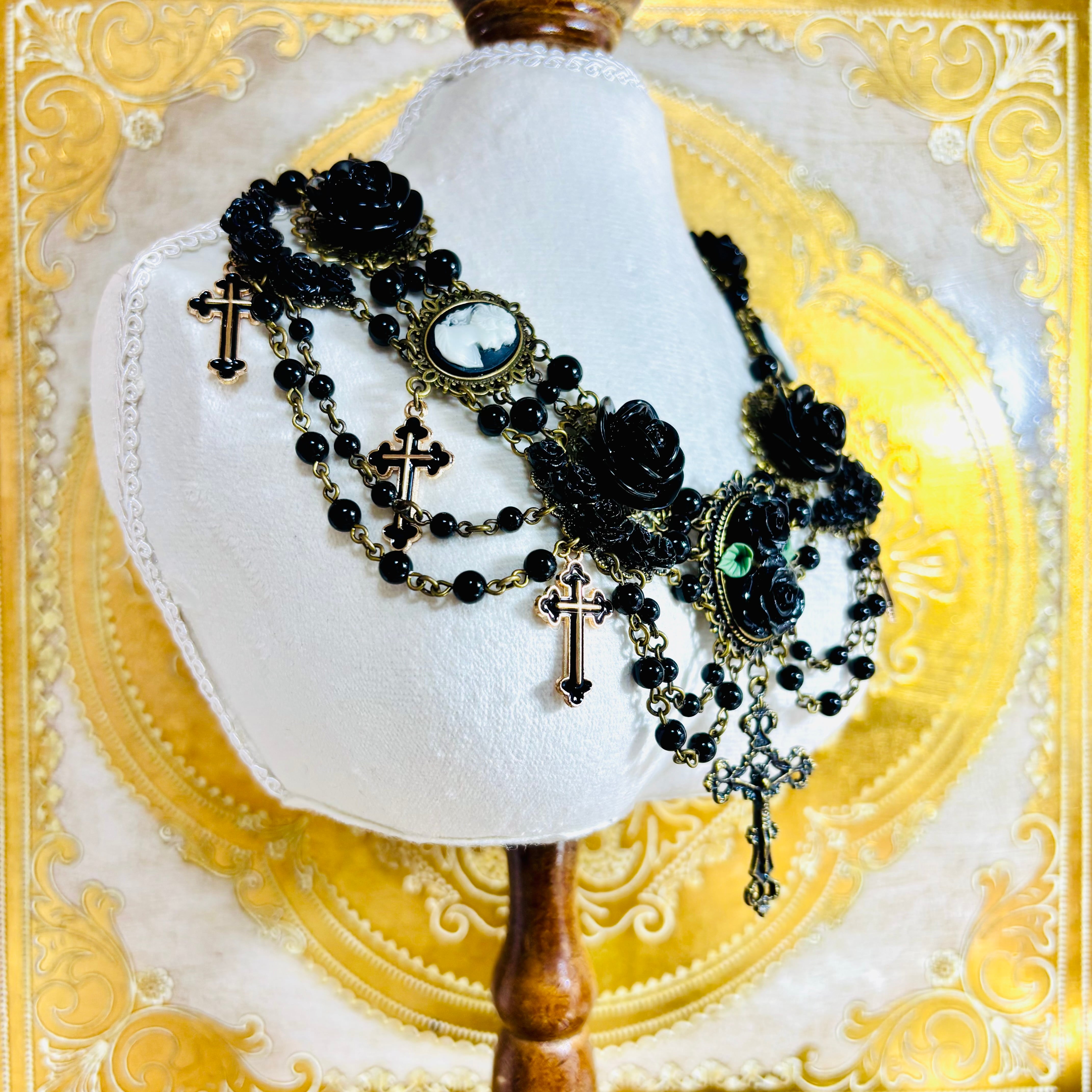黒の薔薇パーツにクロスチャームとカメオを組み合わせたゴシックとエレガントな雰囲気を持つネックレスです