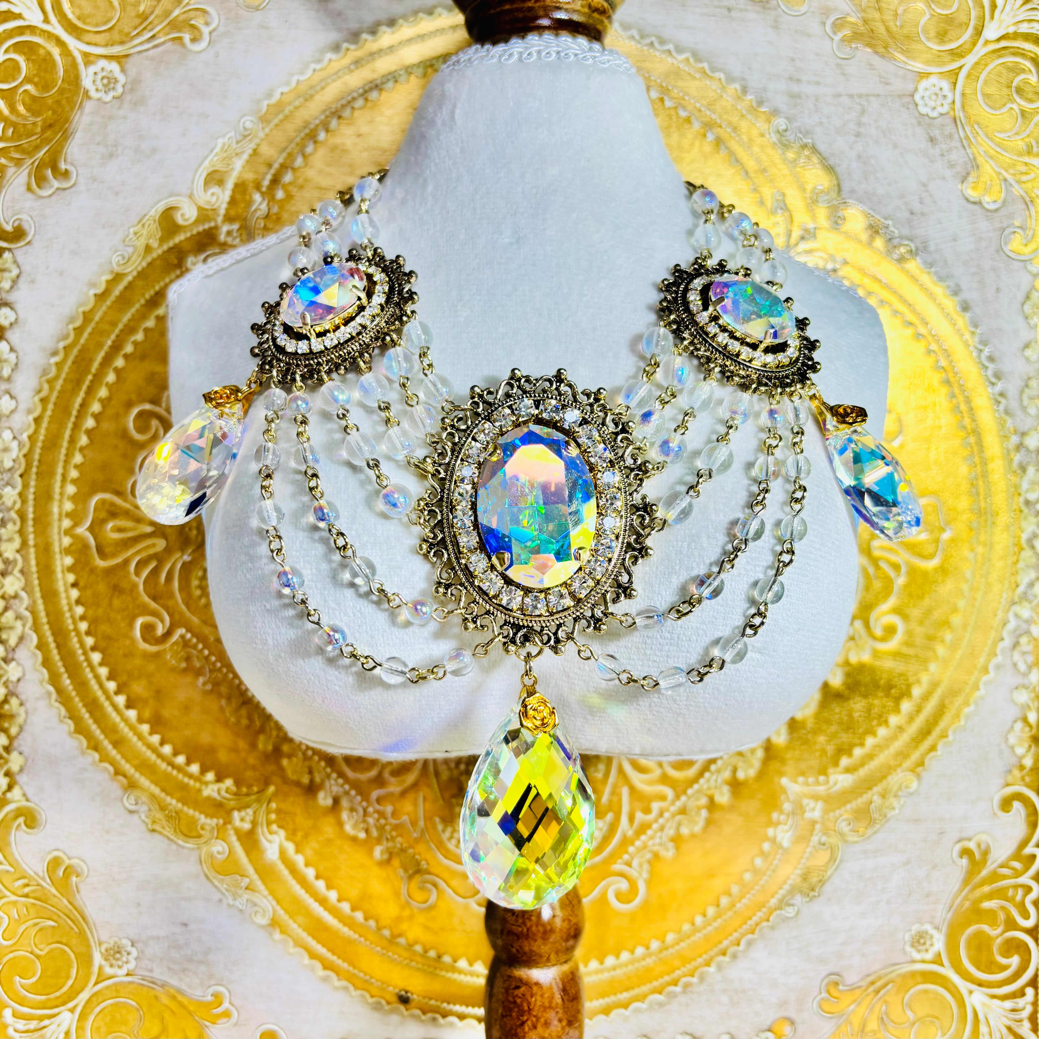 光り輝くオーロラのクリスタルとオーロラカラーのチェコガラスビーズが鮮やかな一品です