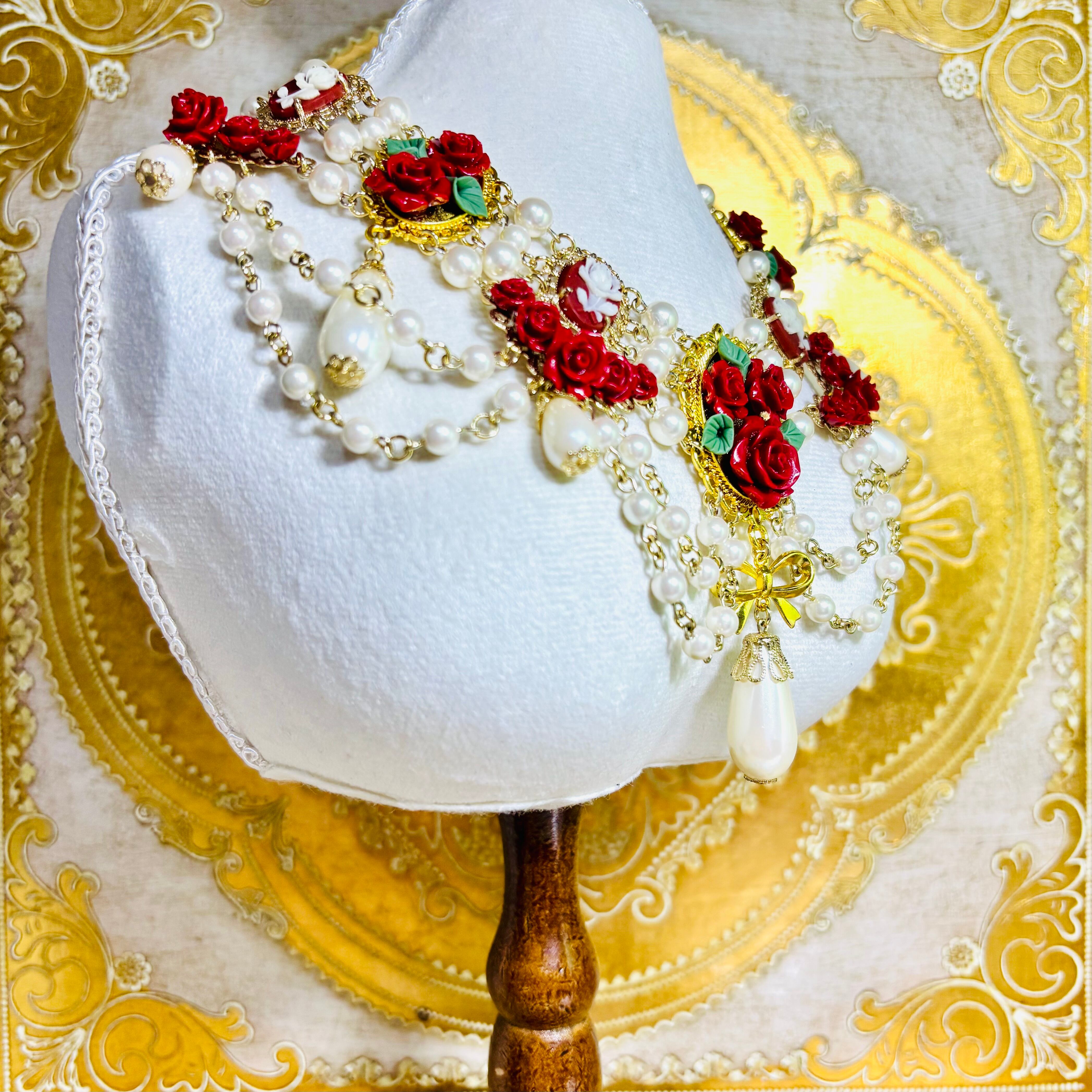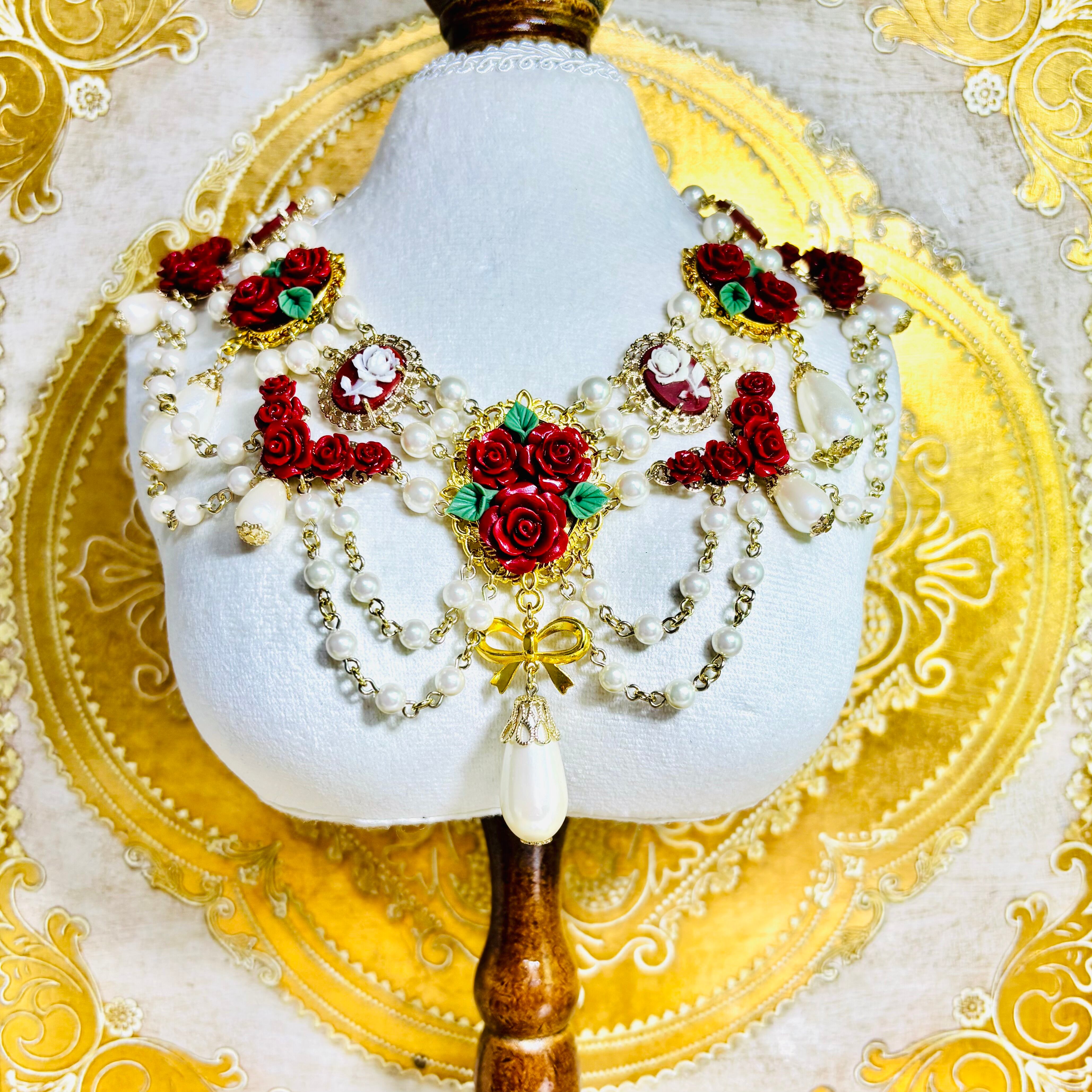薔薇パーツとカメオを使用した華やかでエレガントなネックレスです