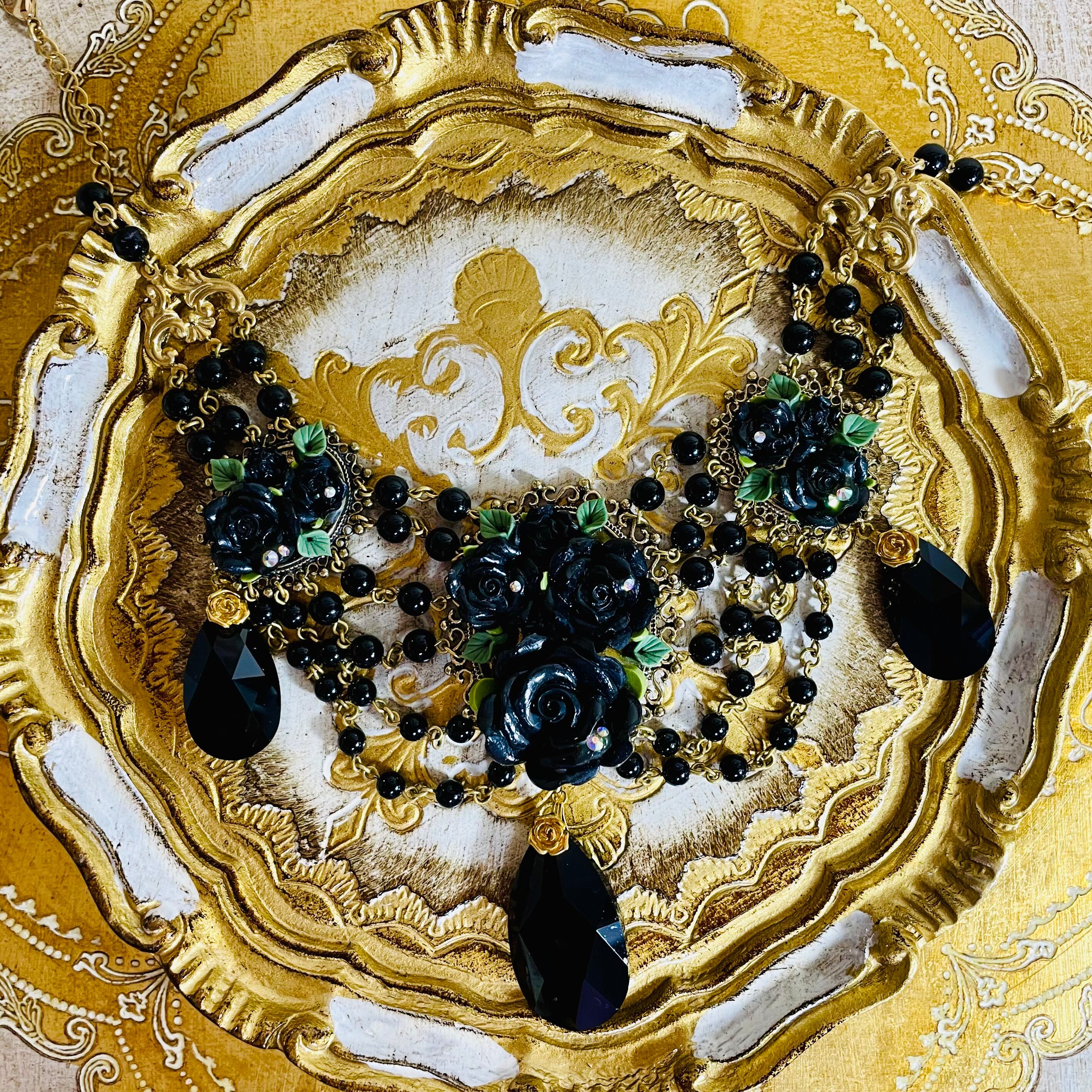 薔薇はソフトクレイ、ブラックビーズは樹脂パール、クリスタルはスワロフスキーのジェットを使用しています。