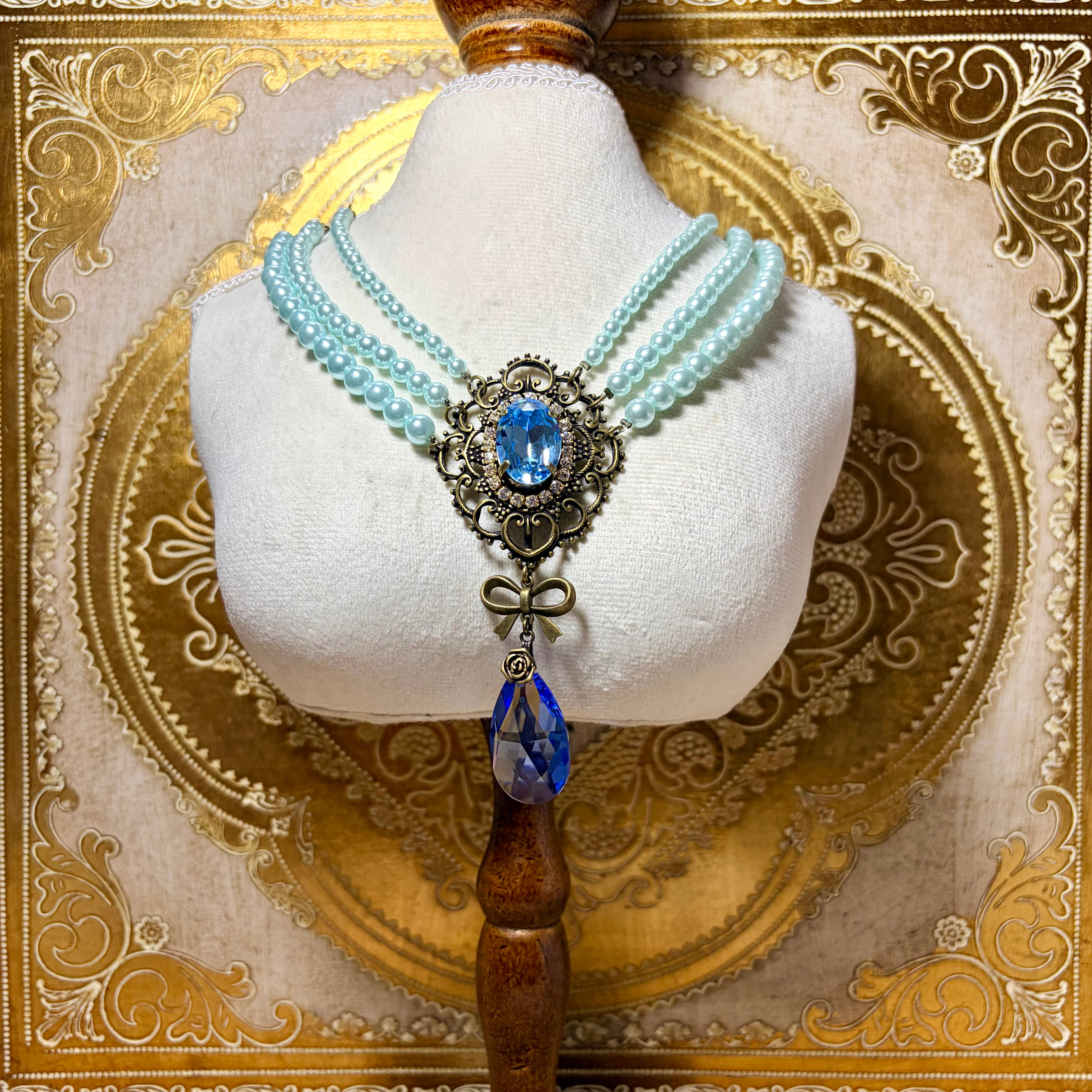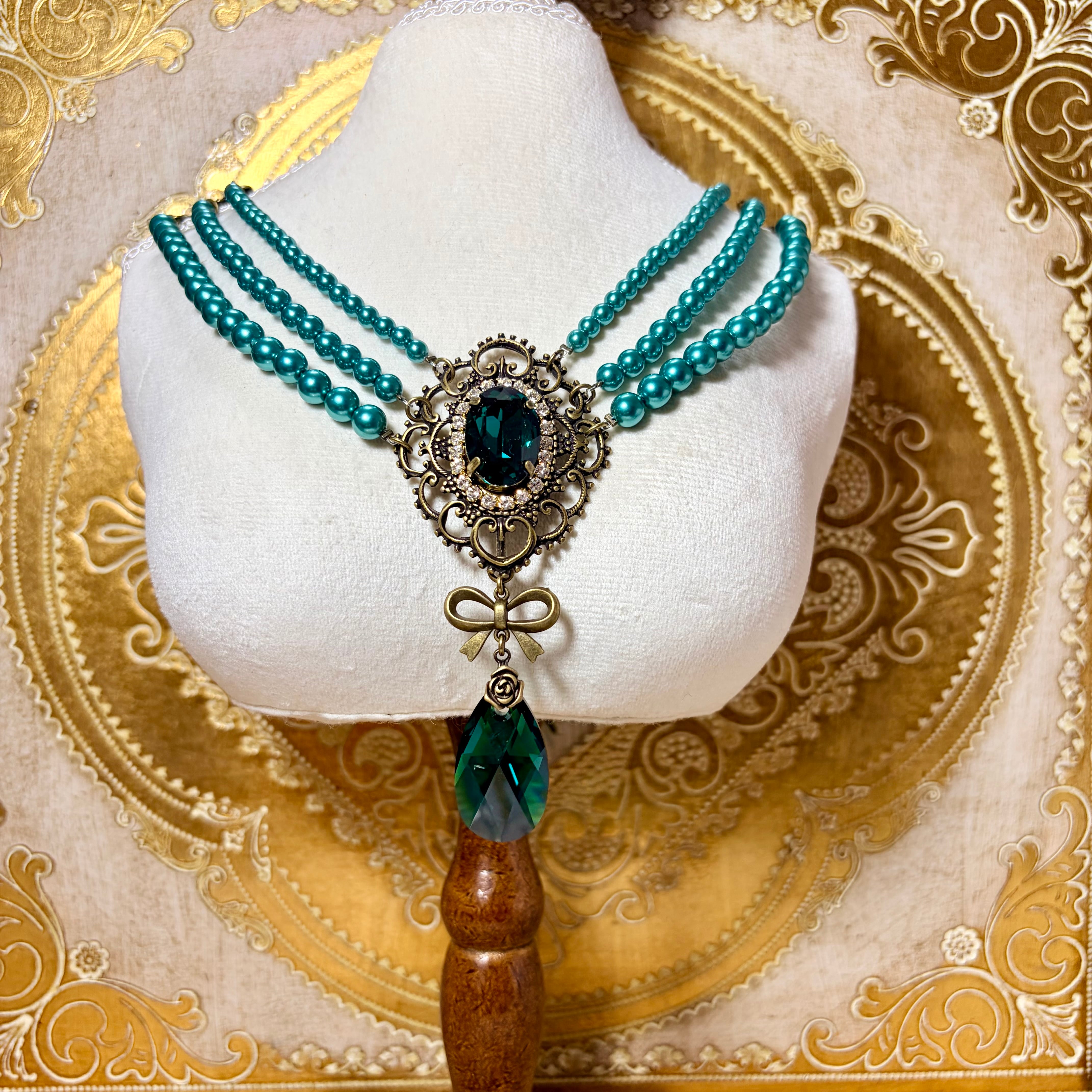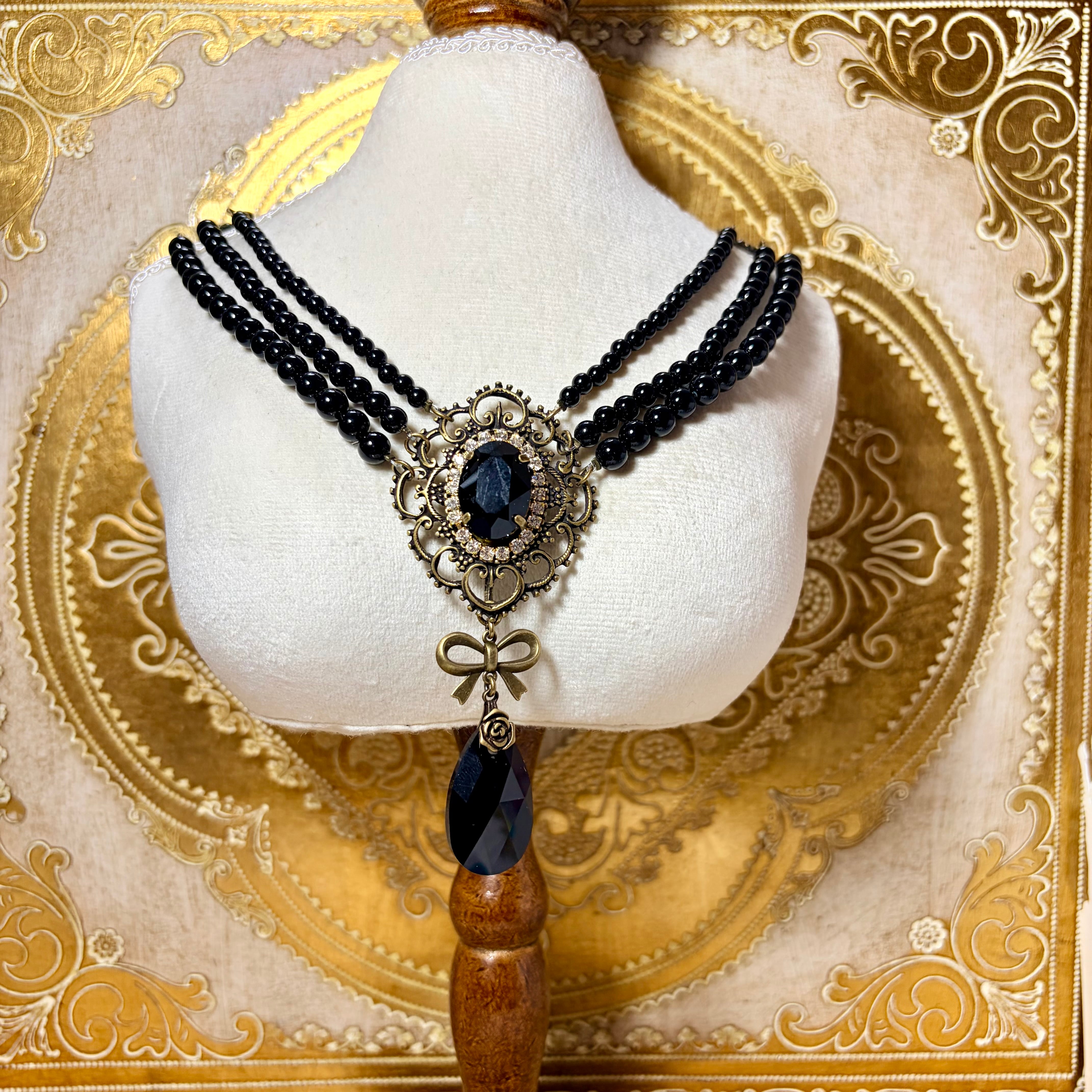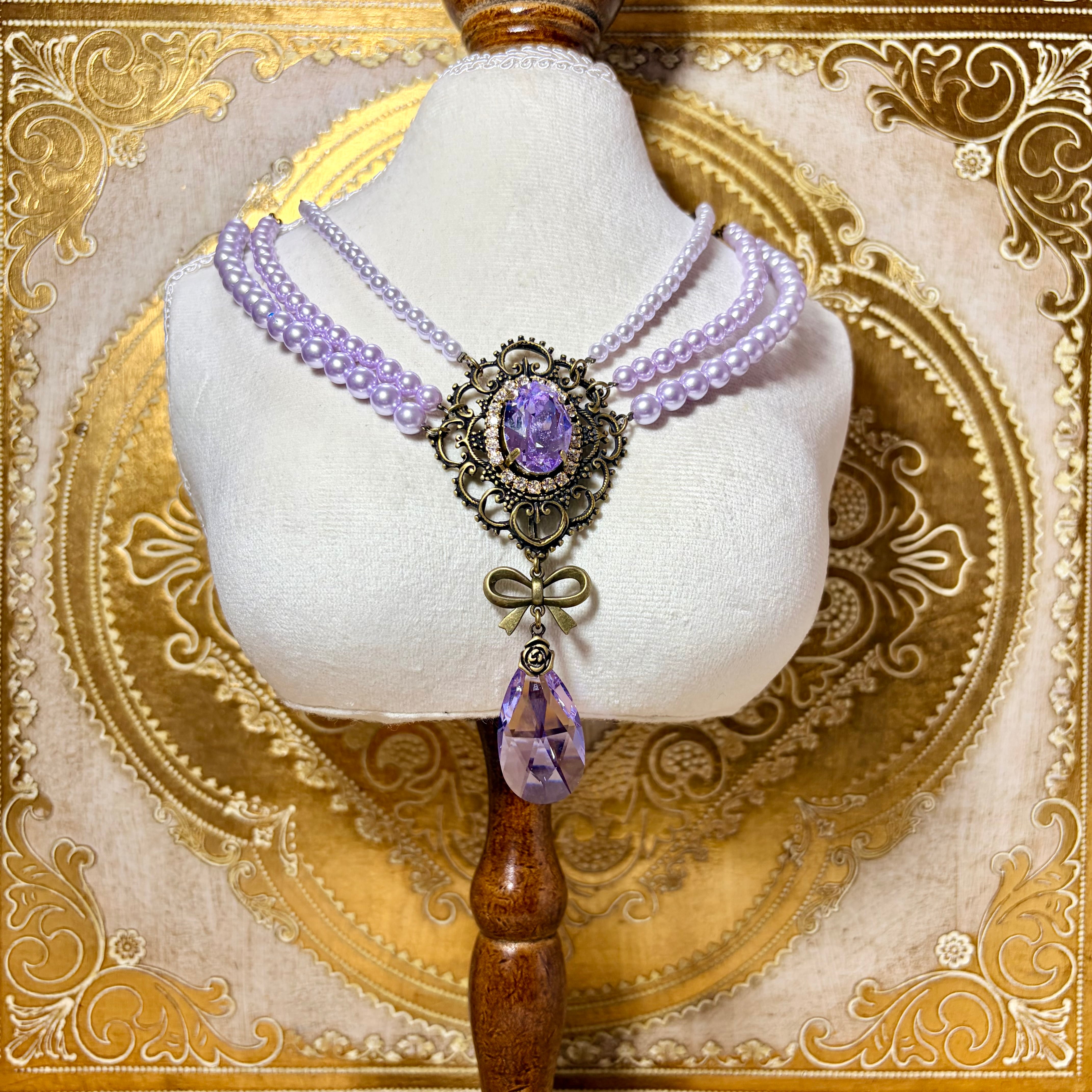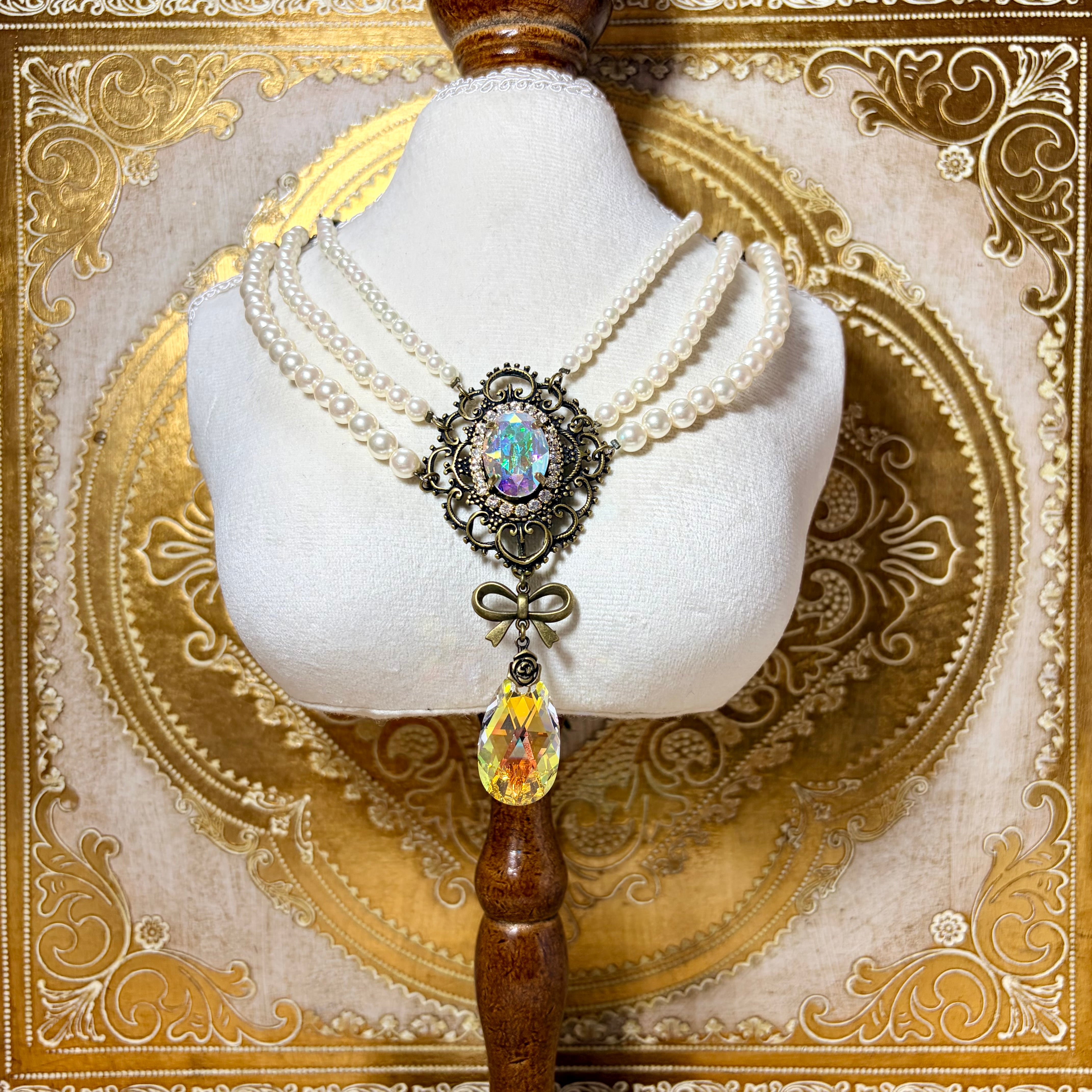 アンティーク風フレームの中にスワロフスキーのクリスタルを組み合わせた、使いやすいサイズの三連パールネックレスです。