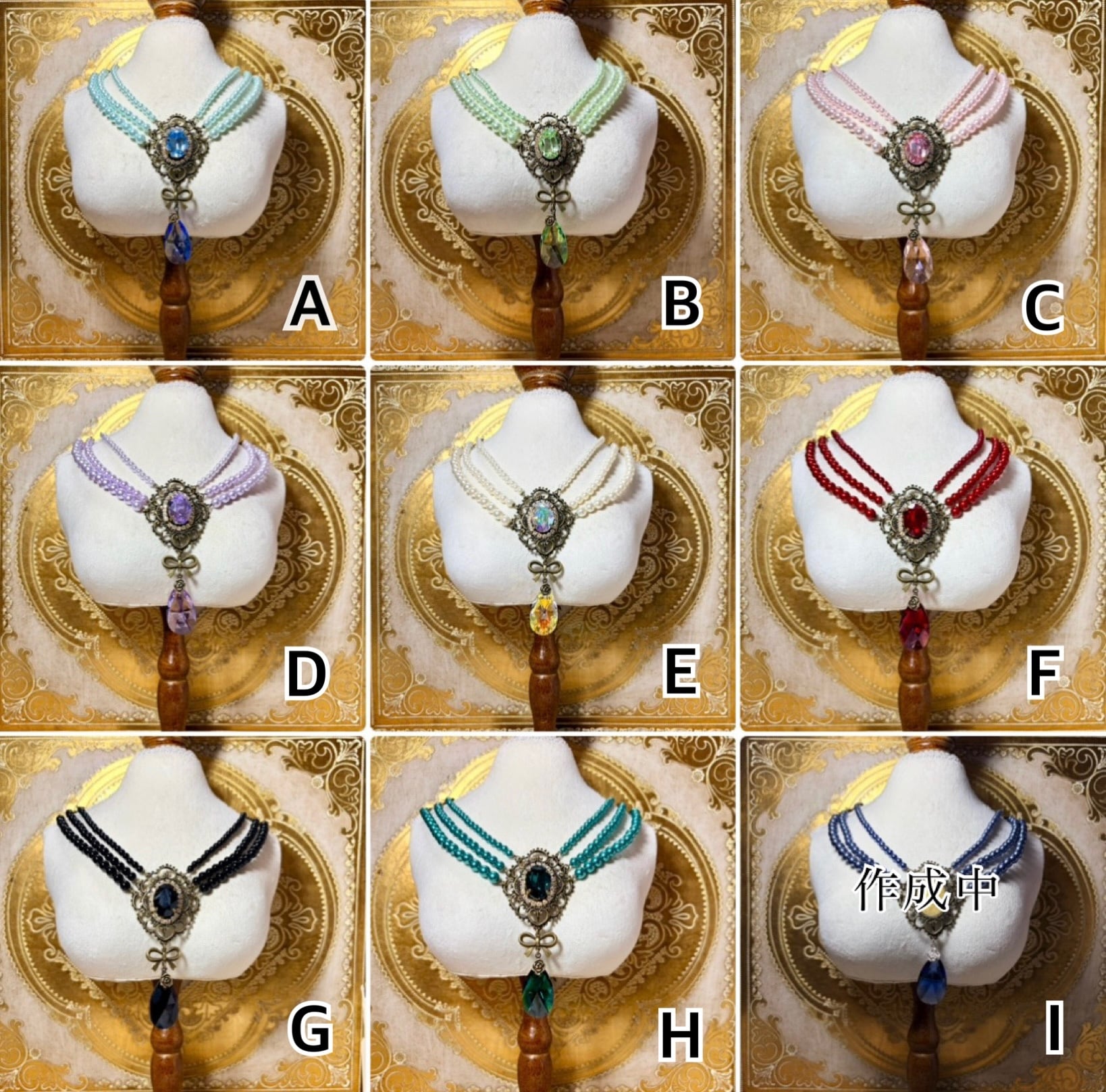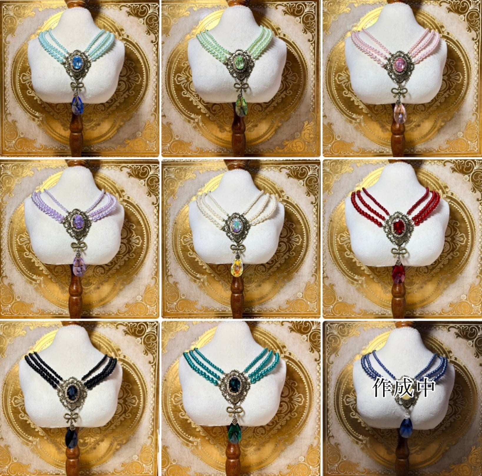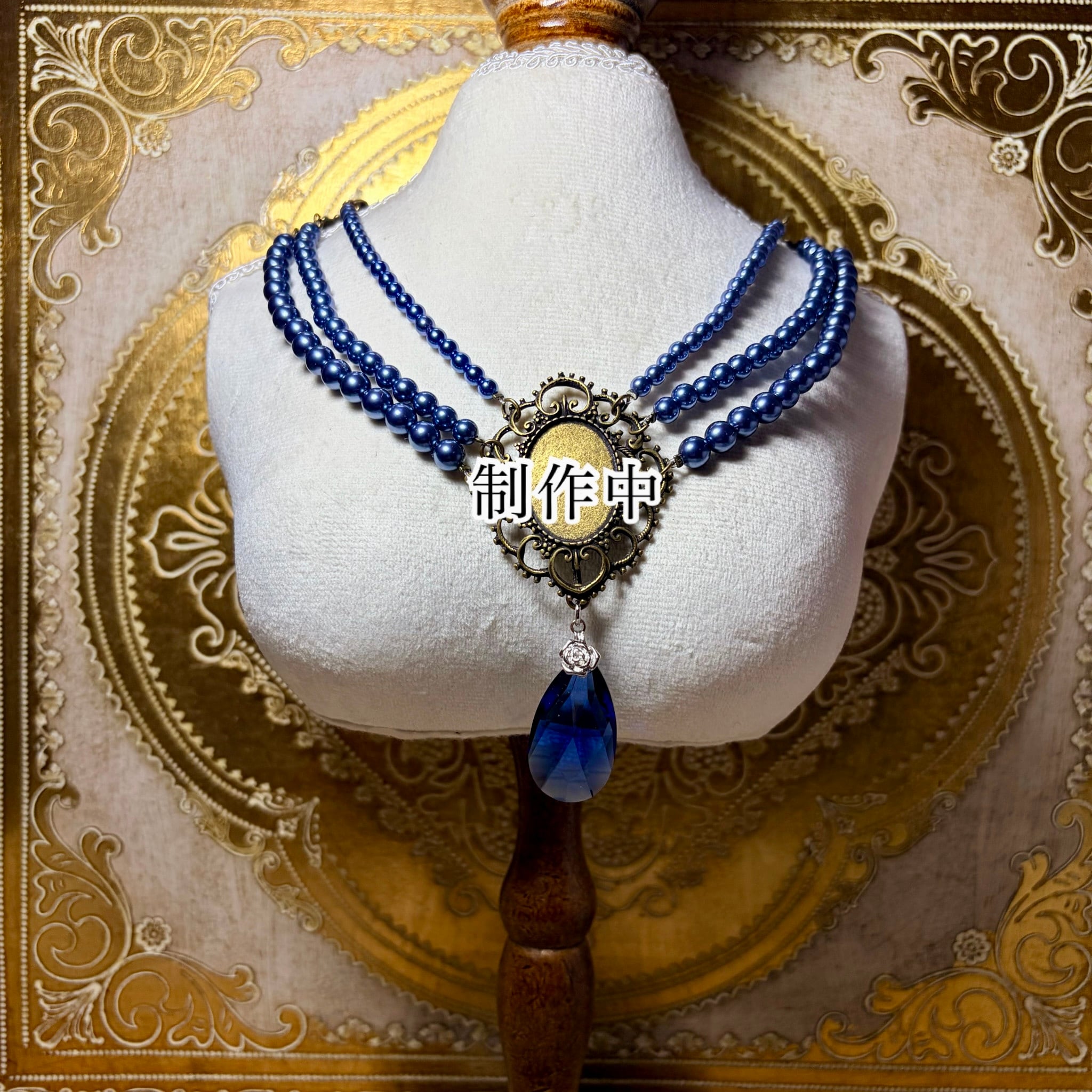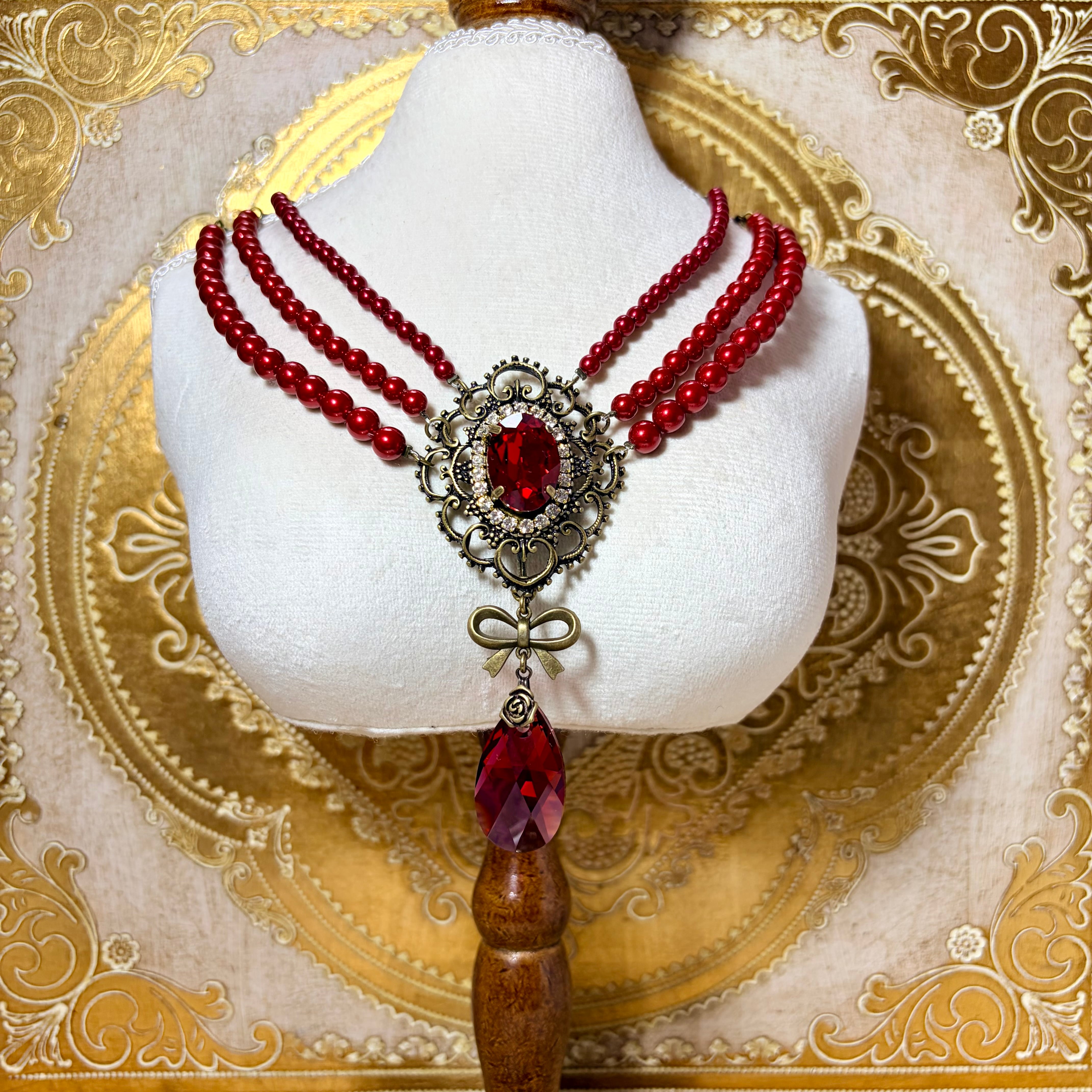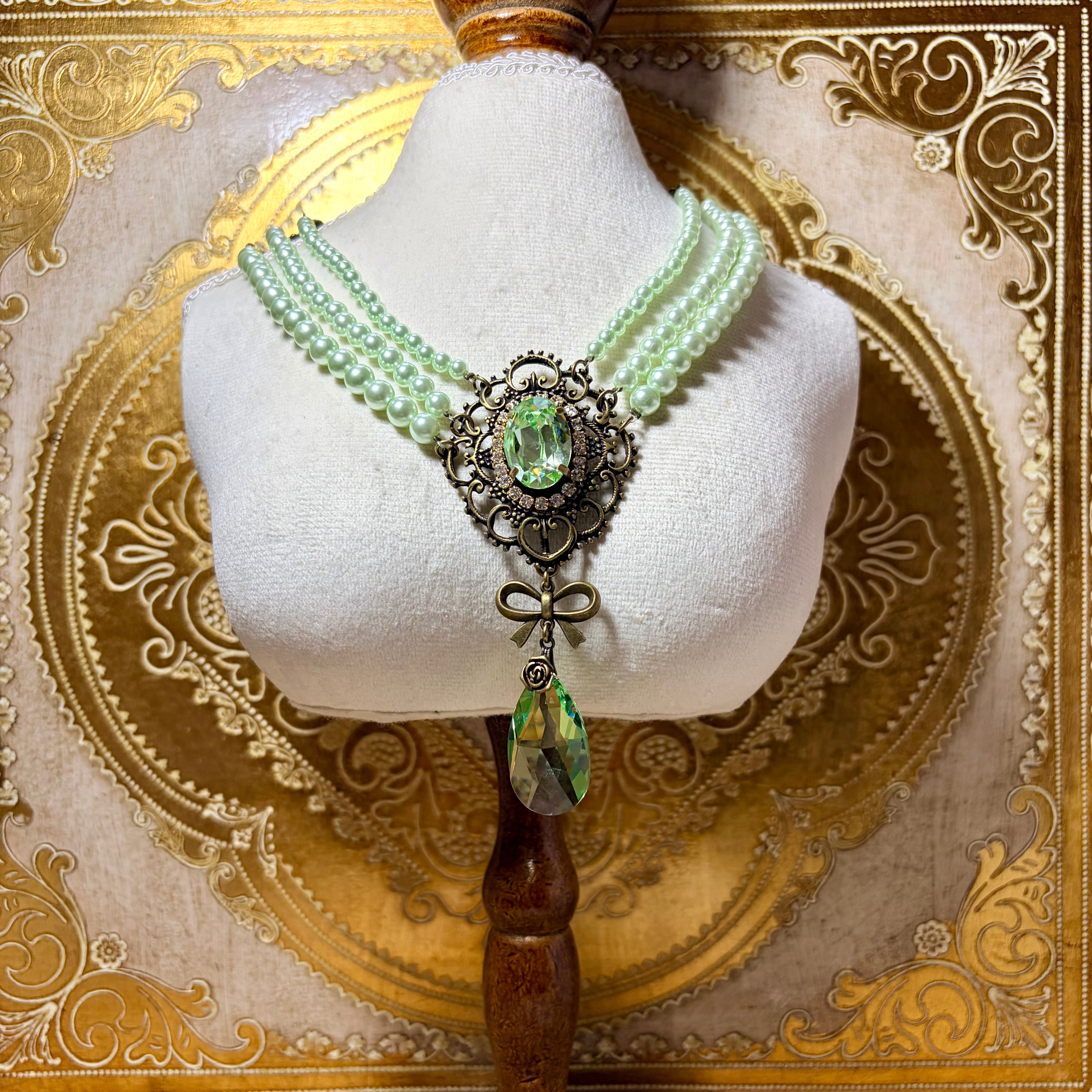 アンティーク風フレームの中にスワロフスキーのクリスタルを組み合わせた、使いやすいサイズの三連パールネックレスです。