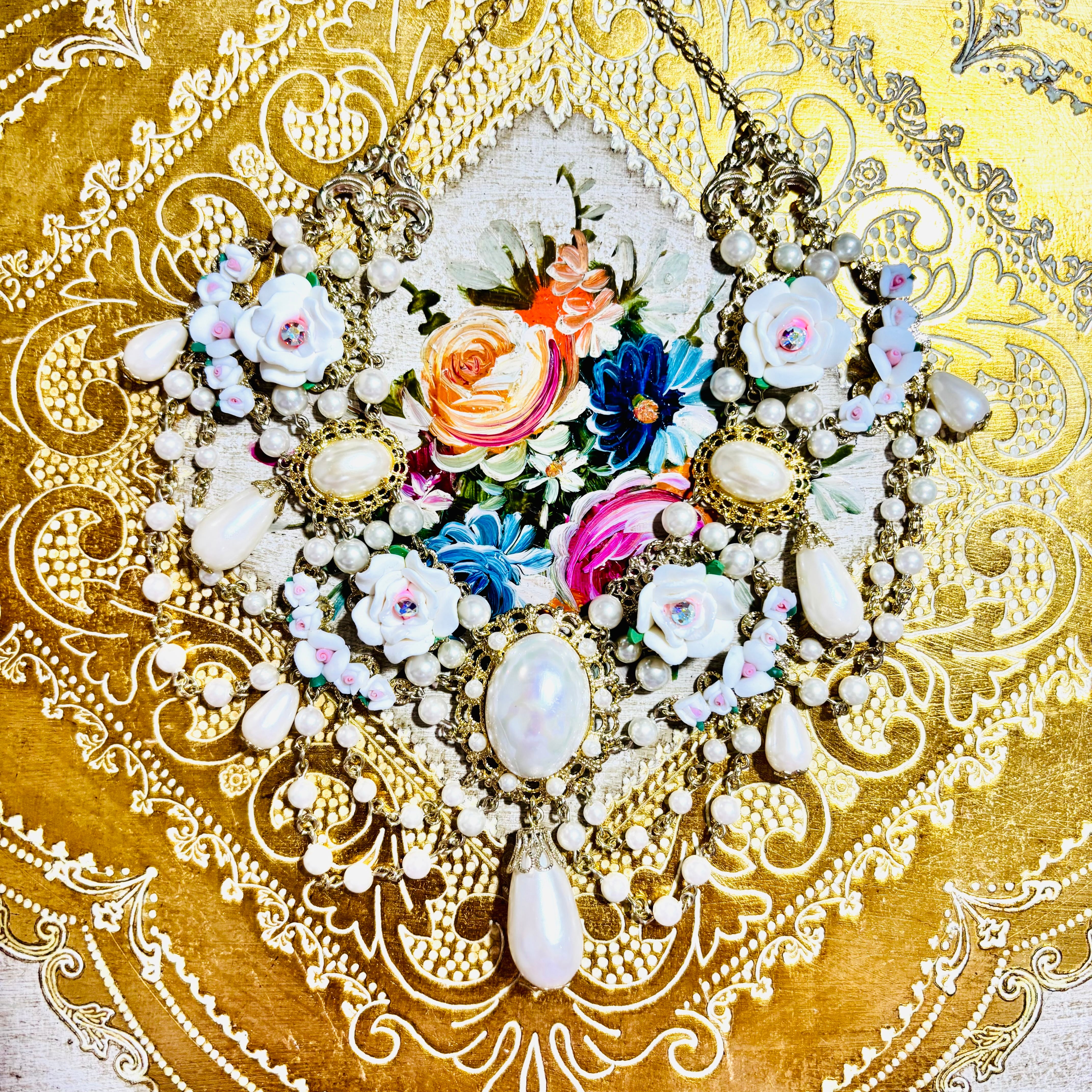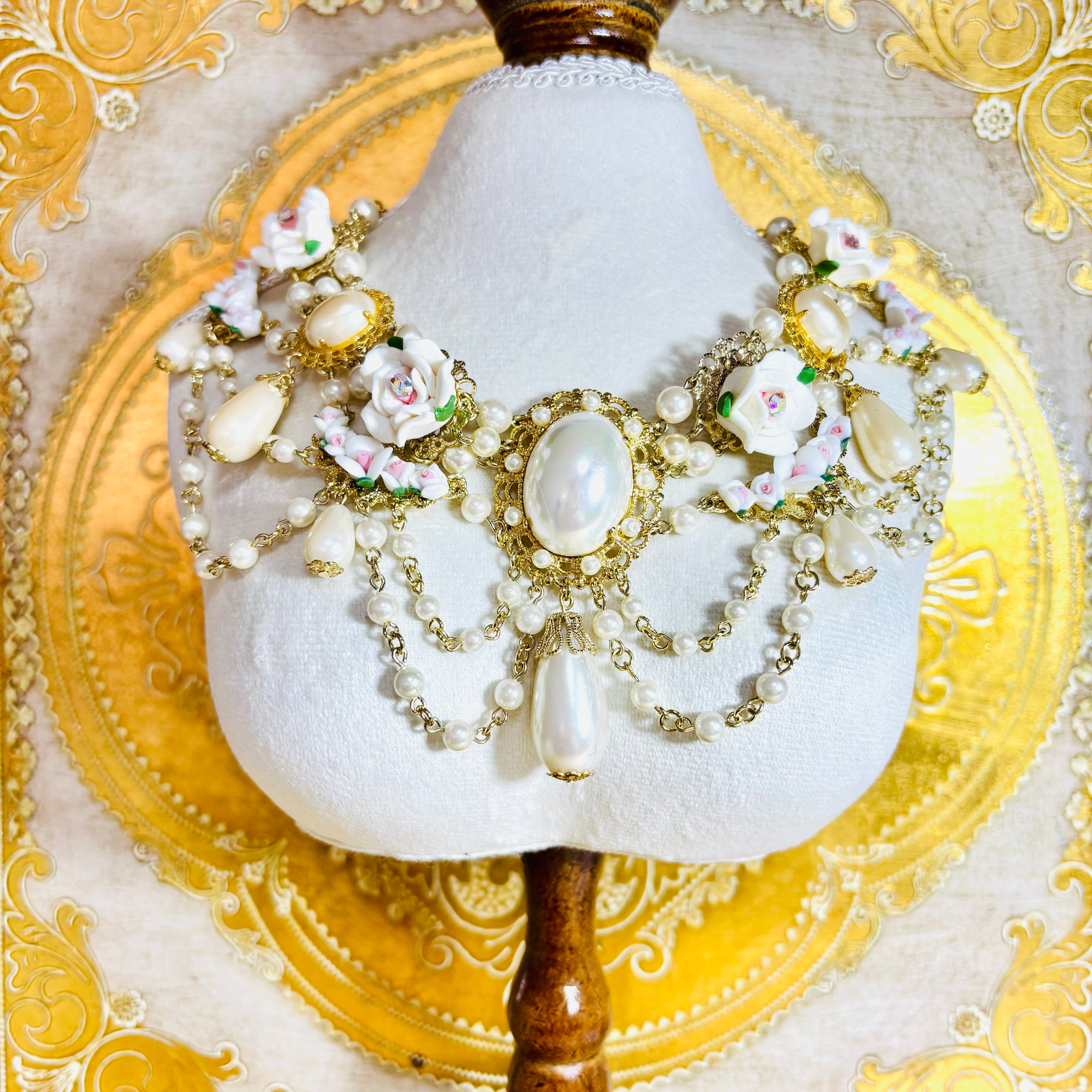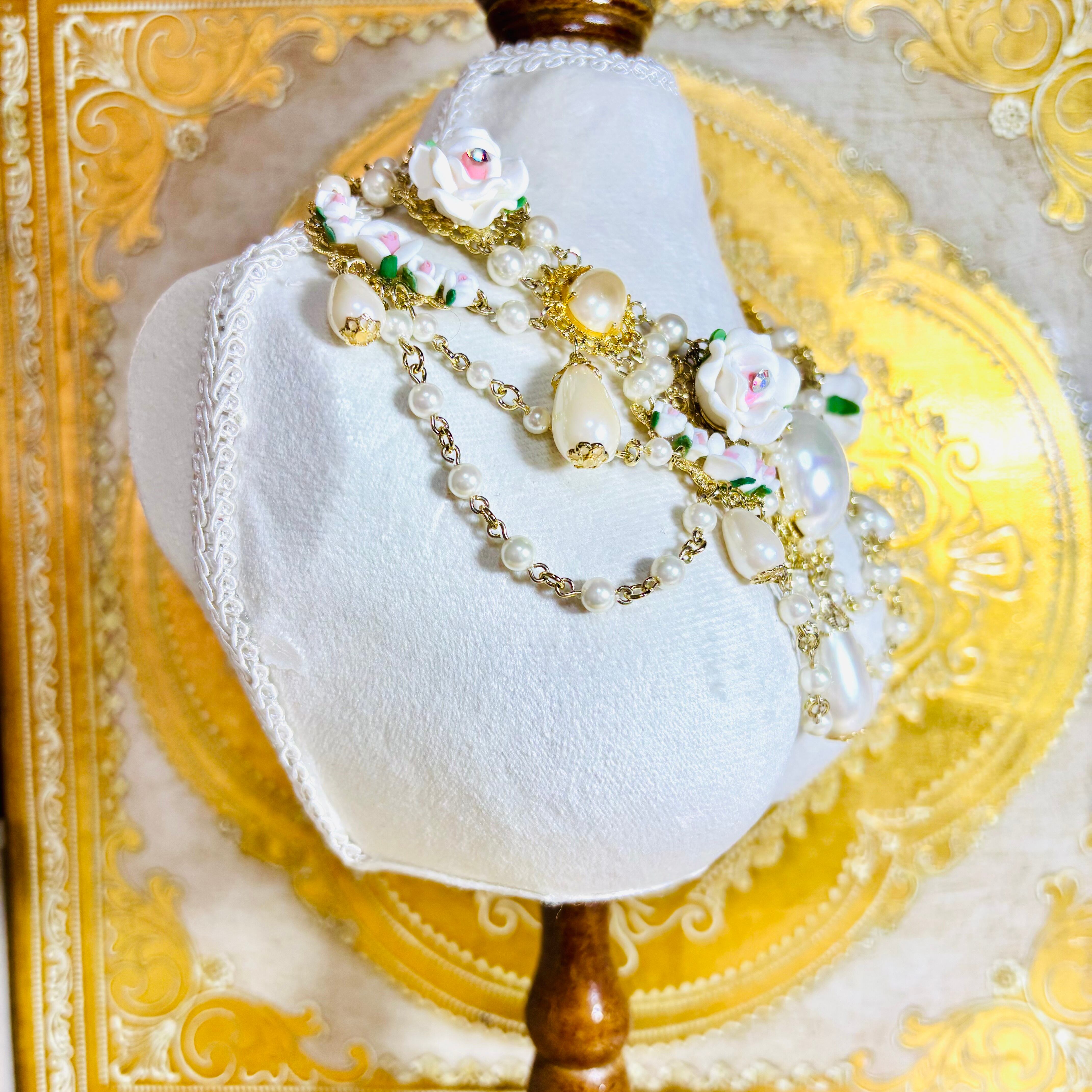セラミックとクレイの薔薇パーツを使った白いブーケのようなネックレスです