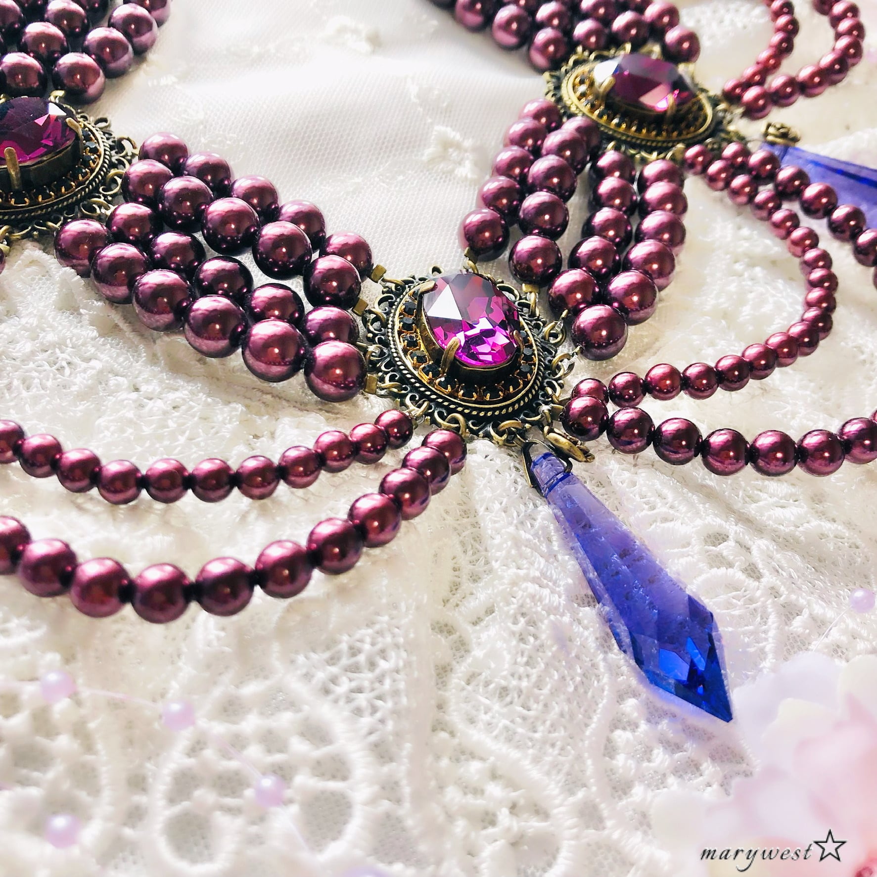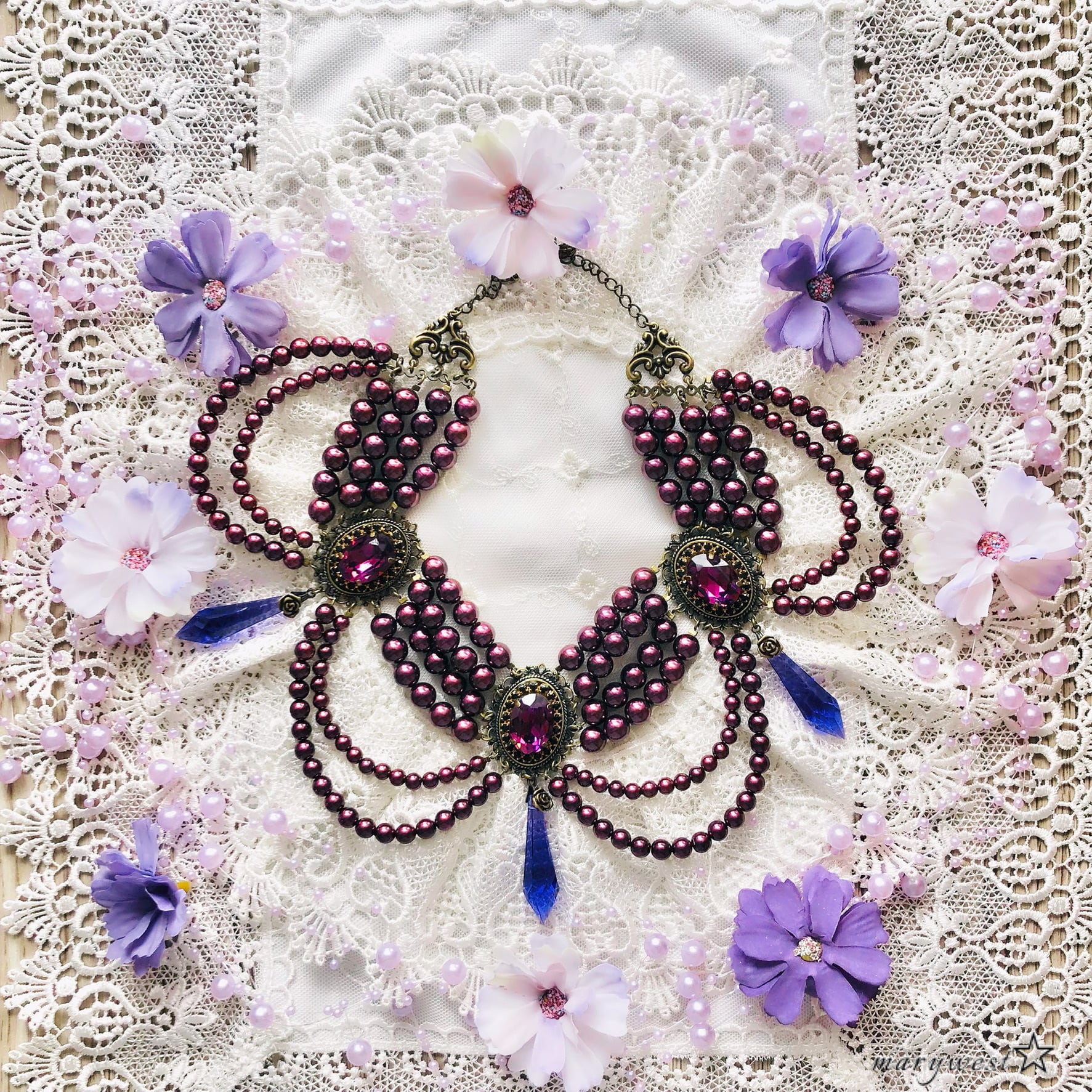 熟成したワインの様な深い色合いのパールとアメジストカラーのクリスタルが美しいネックレスです