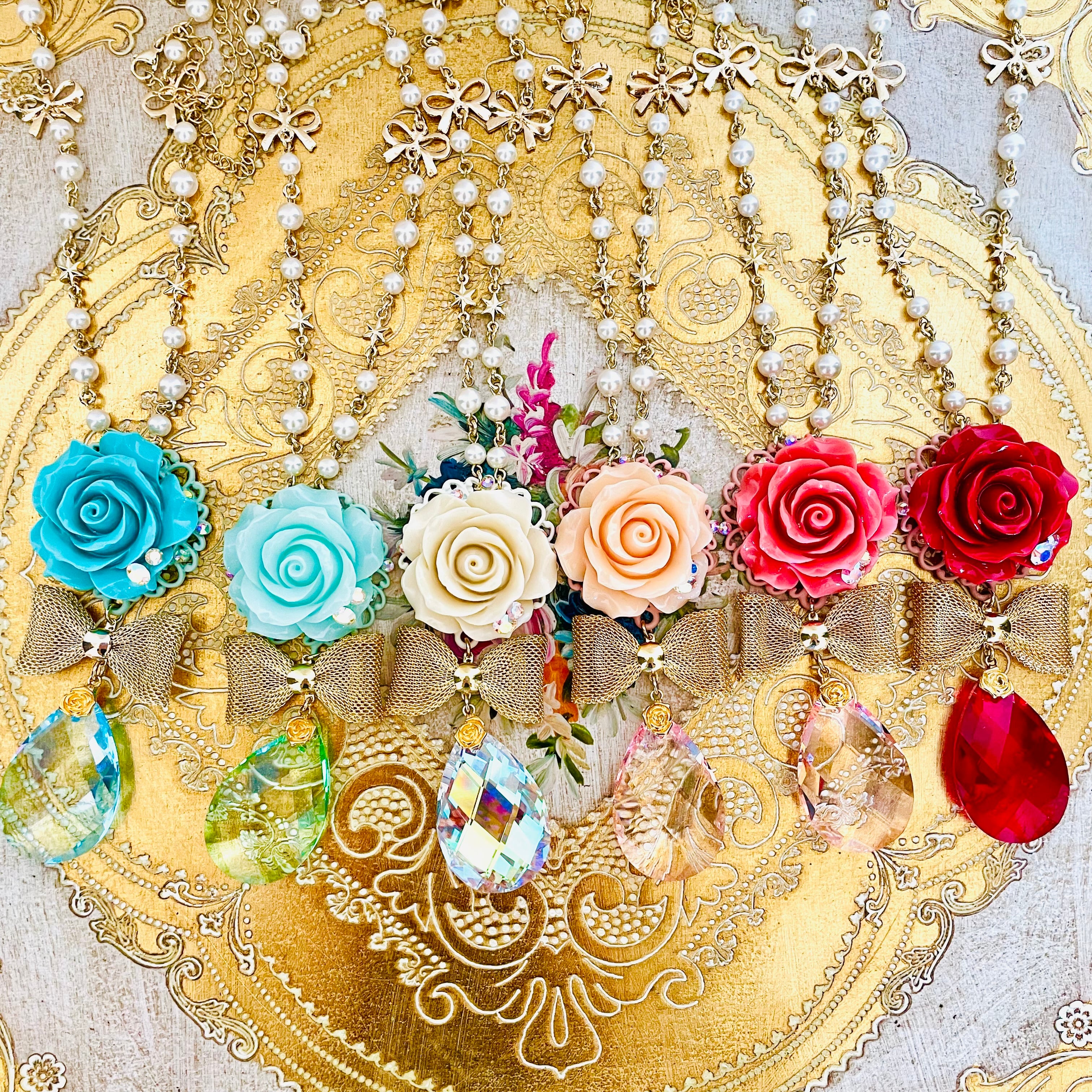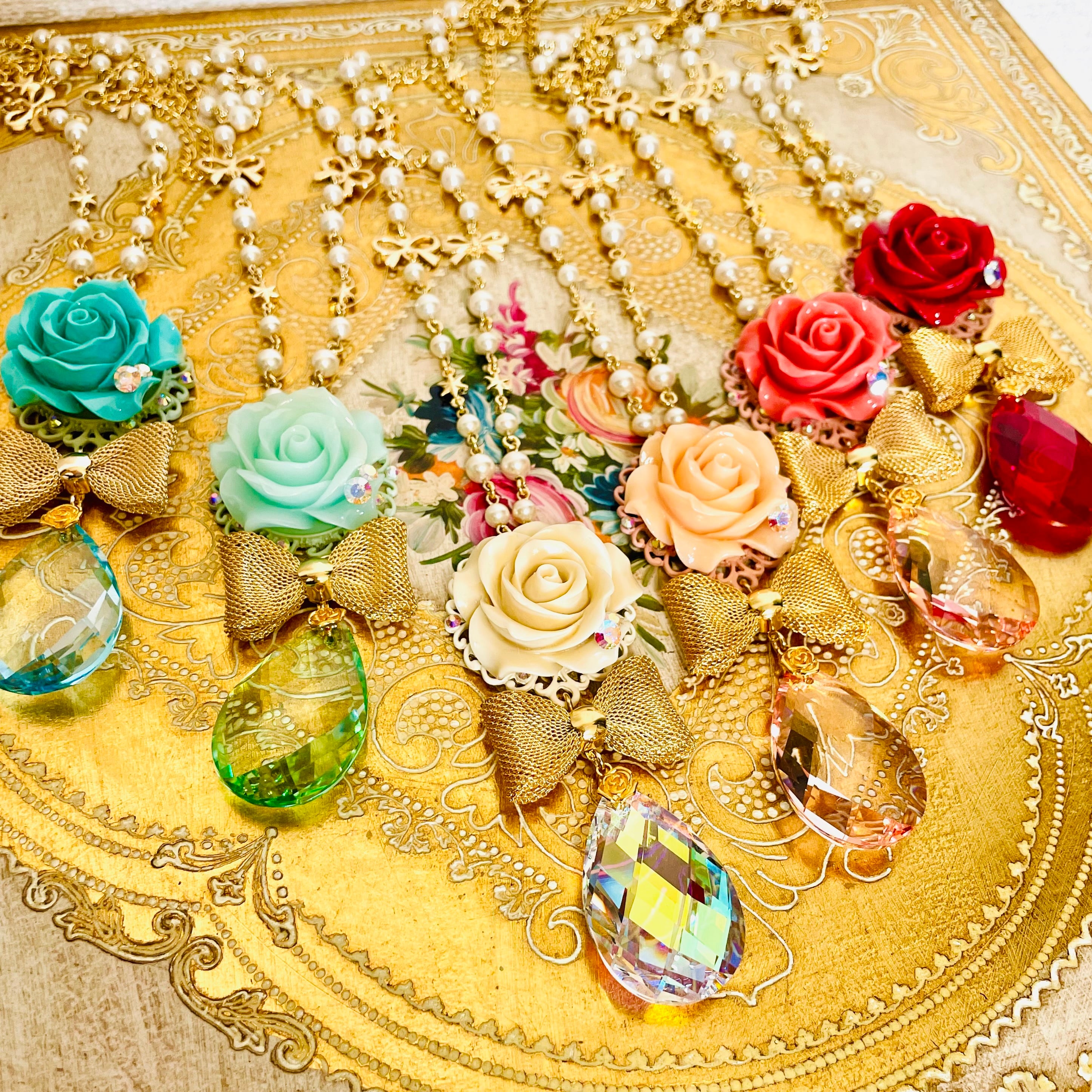 大きな薔薇とシャンデリア用クリスタルのロングネックレス!