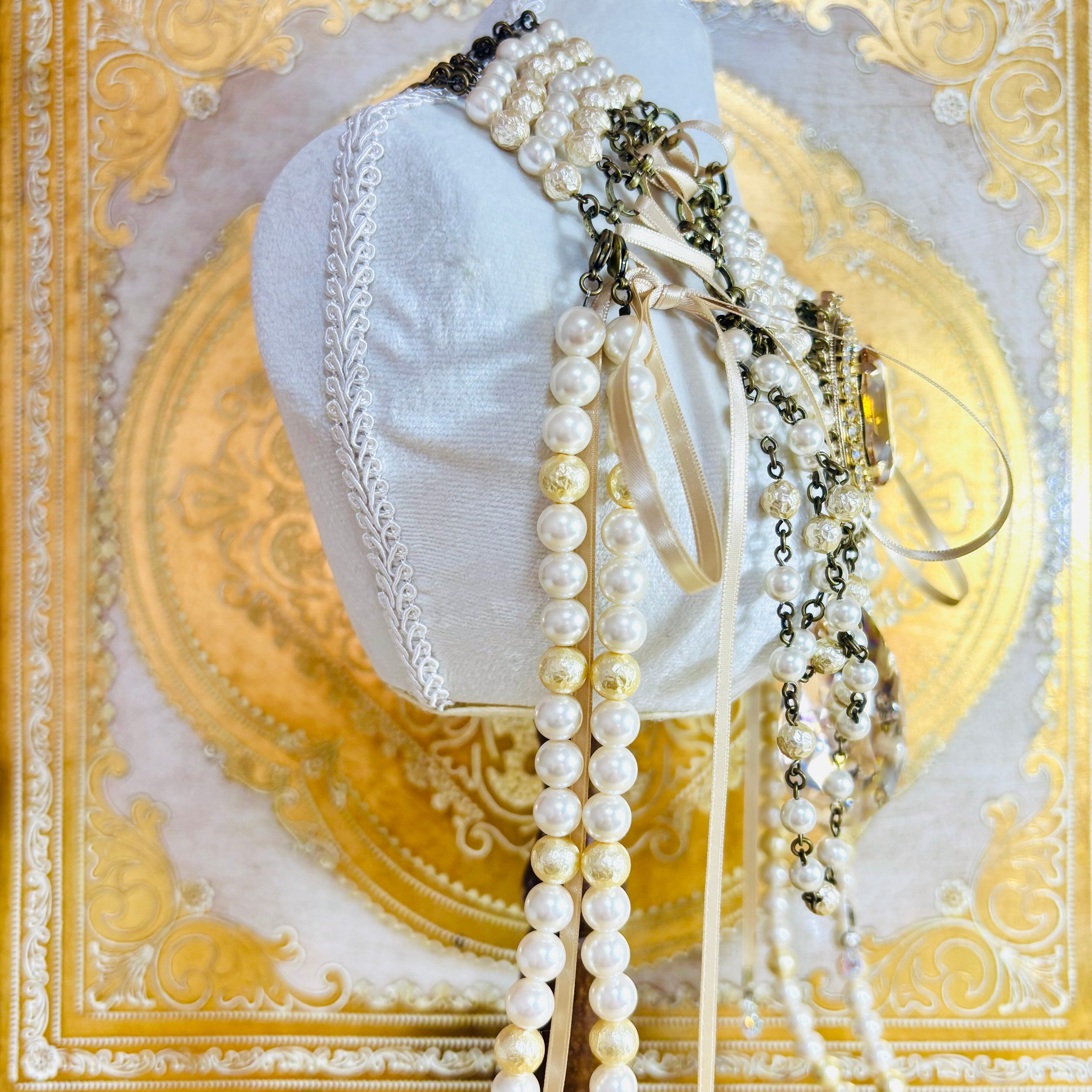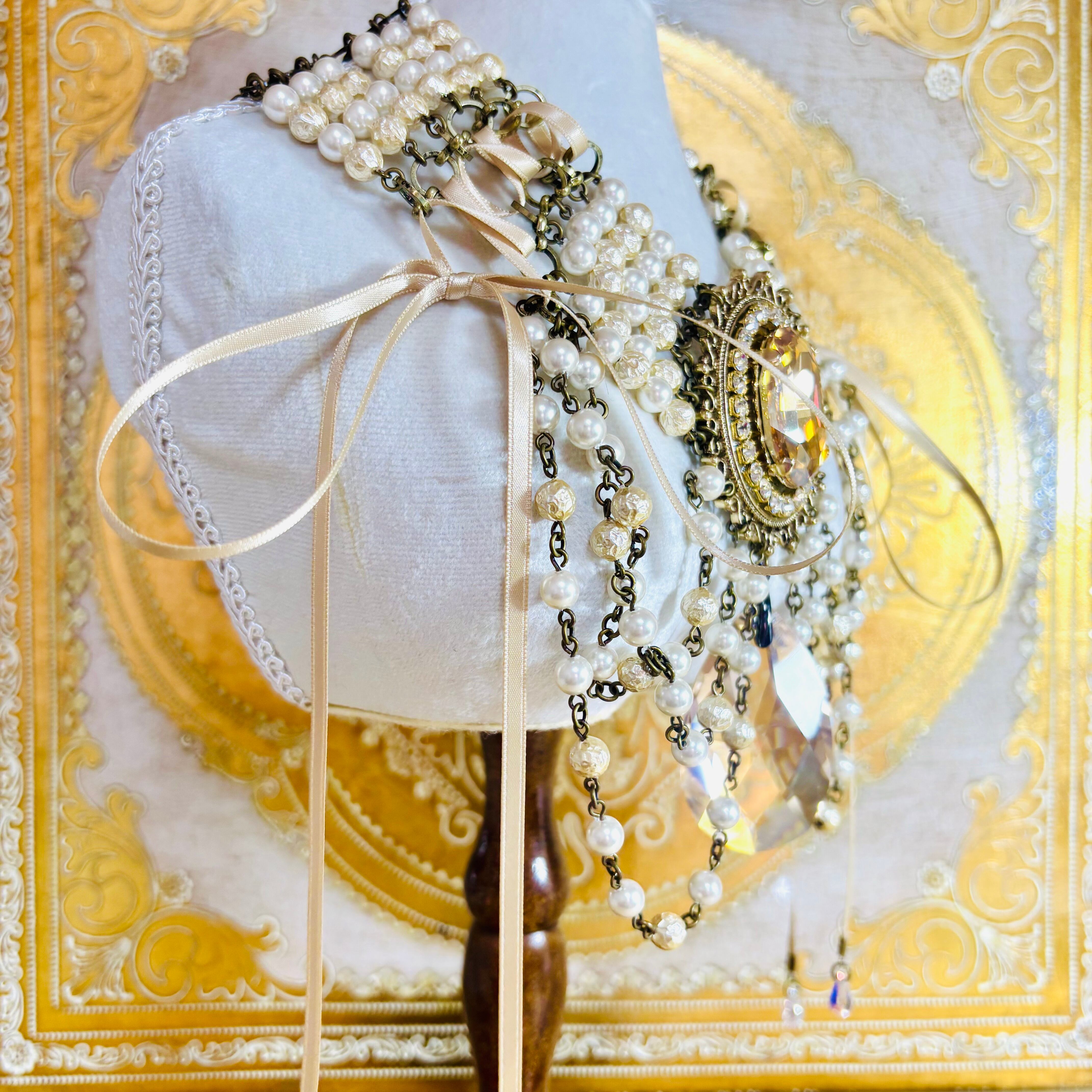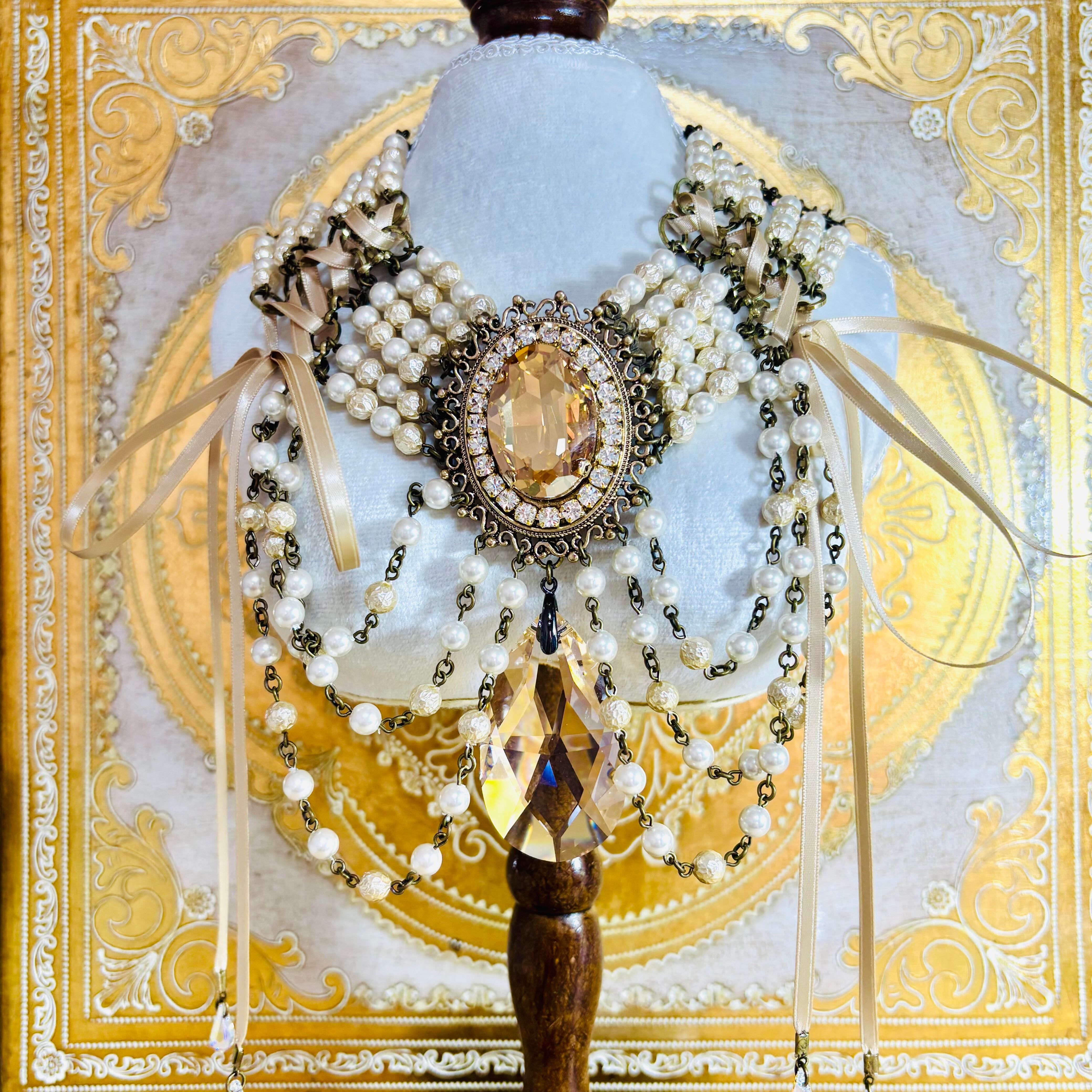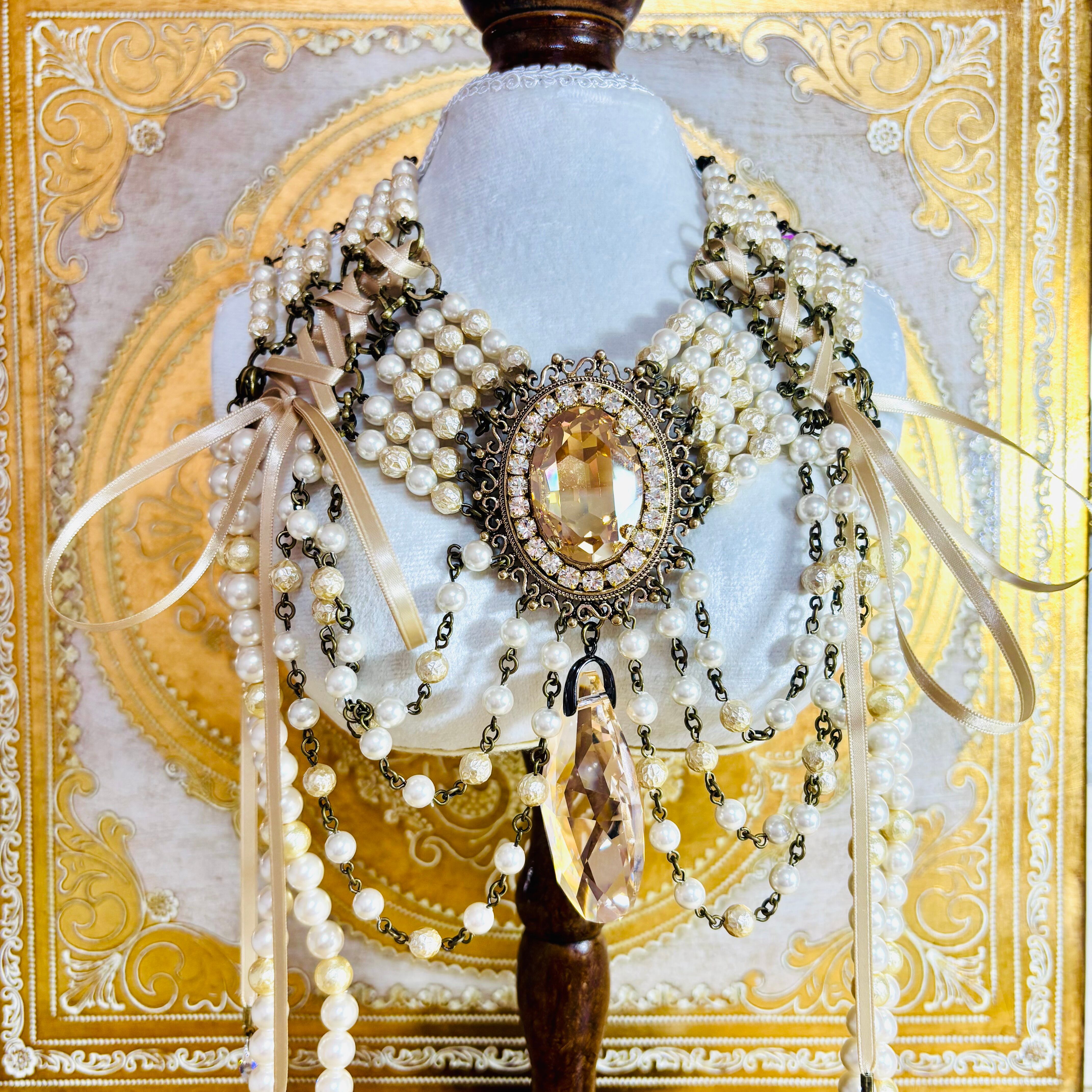 大粒のクリスタルが輝く印象的なコルセットネックレスは胸元から肩先にかけて流れるパールチェーンが取り外し可能です。